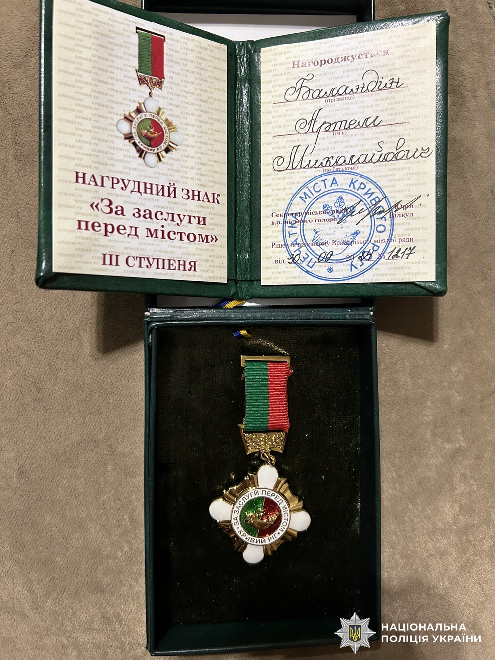 За проявлену мужність і вірність Присязі старшого лейтенанта поліції Артема Баландіна посмертно нагороджено нагрудним знаком «За заслуги перед містом» III ступеня.