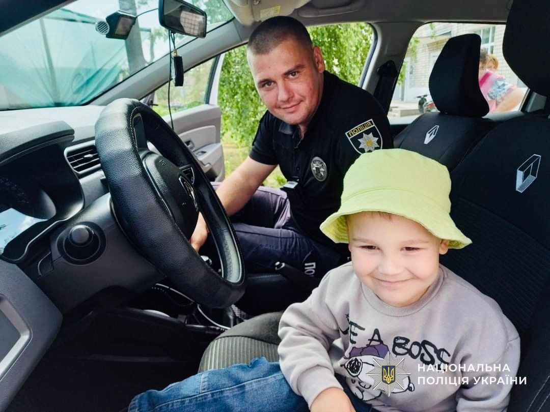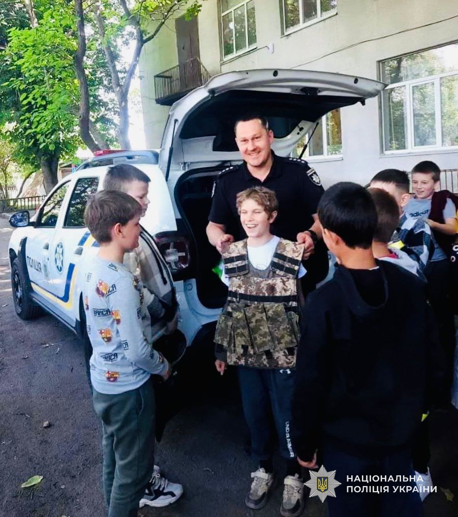 Після пізнавального навчання поліцейські показали дітям свій службовий автомобіль та спеціальне спорядження. Хлопці та дівчата із задоволенням посиділи за кермом автівки й привіталися у гучномовець.