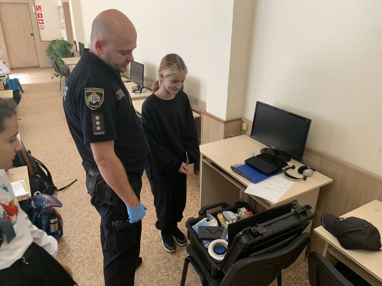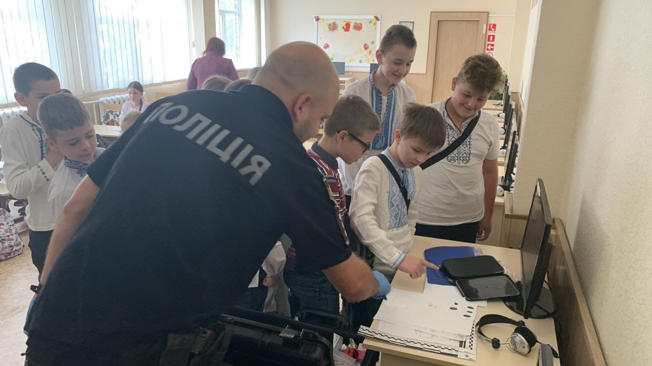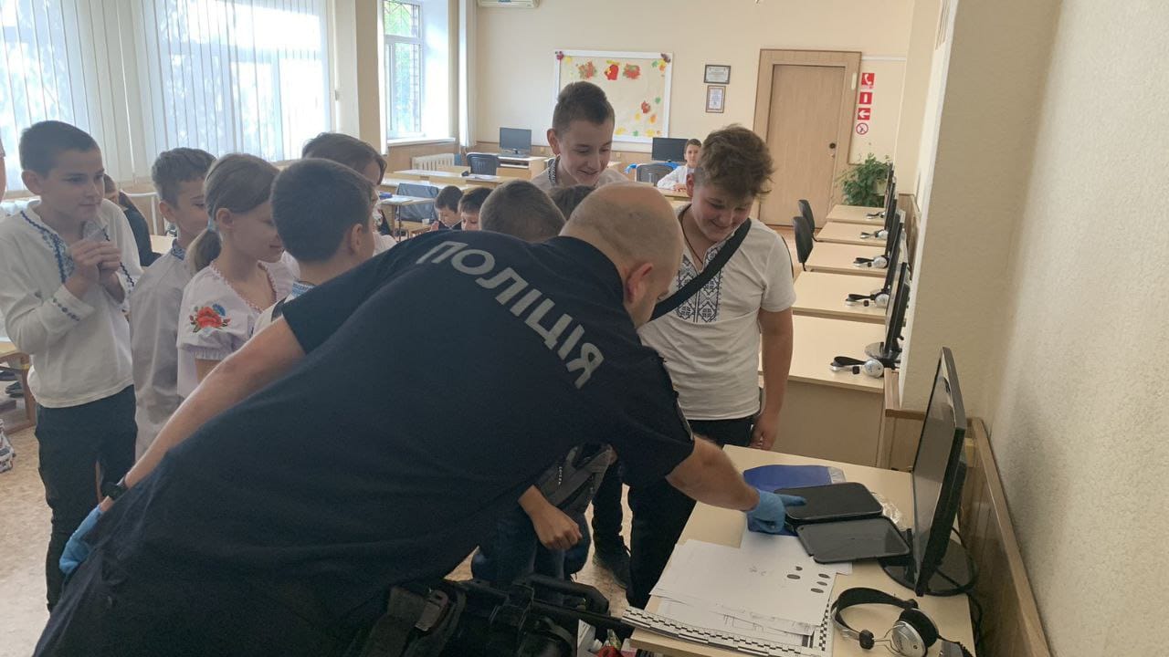 Поліцейській поділився з учнями таємницями своєї професії та розповів, як на місці злочину збирається слідова інформація та знімаються відбитки пальців. Діти з цікавістю слухали спеціаліста та із захопленням оглядали вміст експертної валізи, з якою правоохоронці працюють на місці вчинення кримінальних правопорушень. Кожен із бажаючих мав змогу відчути себе у ролі криміналіста та зробити свій відбиток. Також поліцейський розповів як виглядають вибухові предмети, боєприпаси та наскільки небезпечними можуть бути подібні знахідки на вулиці. Учням нагадали, що у разі знахідки невідомого предмету за зовнішніми ознаками схожого на вибухонебезпечний - у жодному разі його не чіпати, не переносити, не розбирати, а про небезпечну знахідку обов`язково попередити дорослих або зателефонувати на лінію «101», «102».