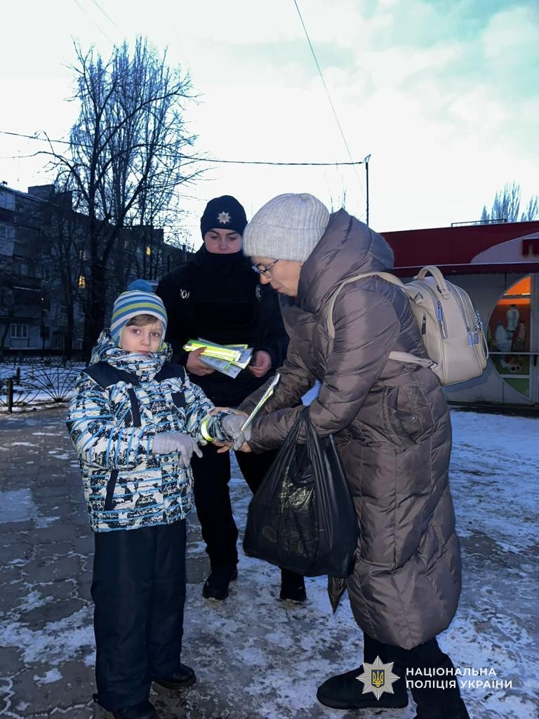 12 січня офіцери поліції на вулицях міста роз’яснили дітям і їх батькам і про важливість носіння світловідбиваючих елементів у темну пору доби.