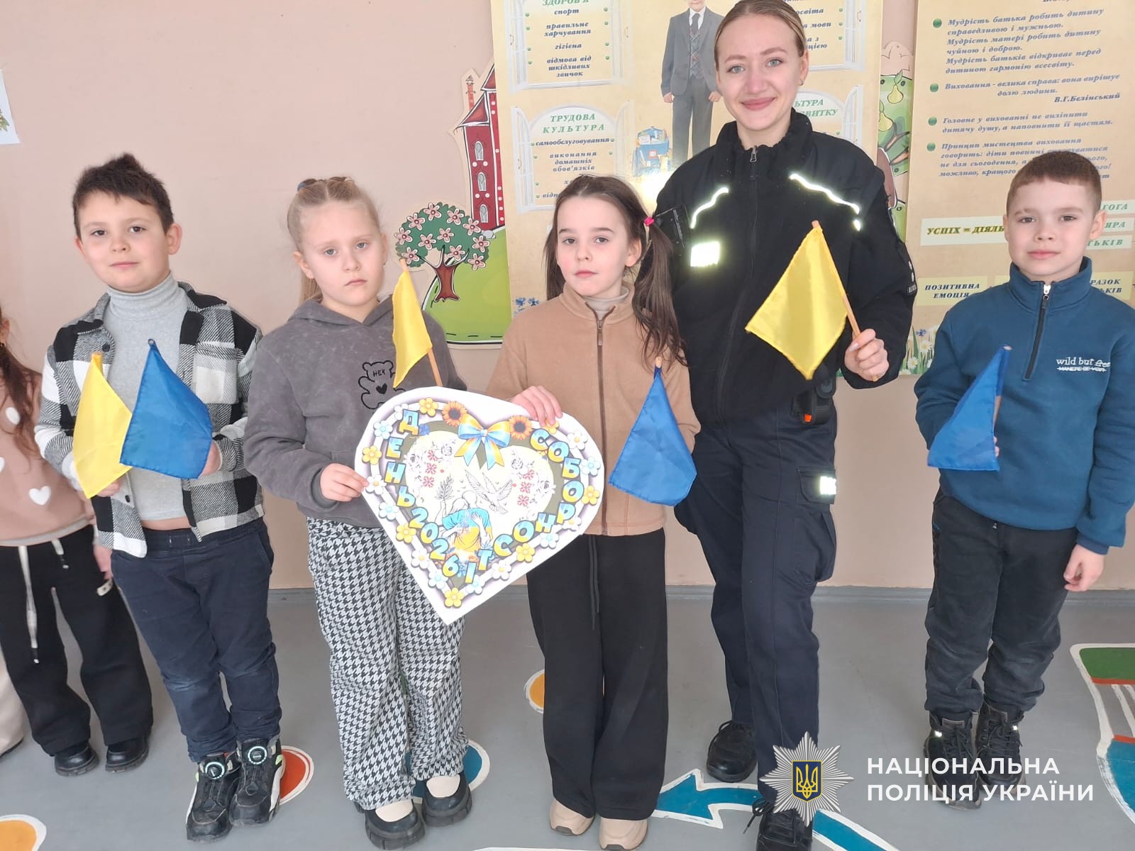 Також школярі разом із поліцейськими виготовляли паперові сердечка в державних кольорах як символ України та єдності. На них діти писали свої асоціації з Україною, єдністю, а також щирі побажання миру, перемоги й добробуту нашій державі.