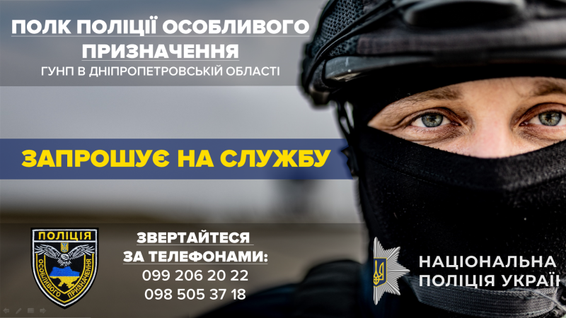 Запрошуємо вас пройти етапи відбору та долучитися до лав Національної поліції України, до полку поліції особливого призначення, на посаду – поліцейський.