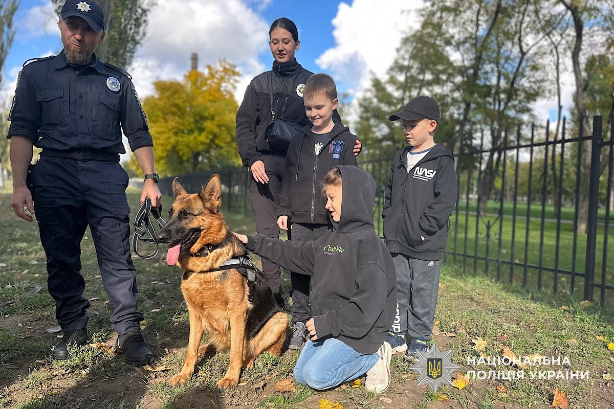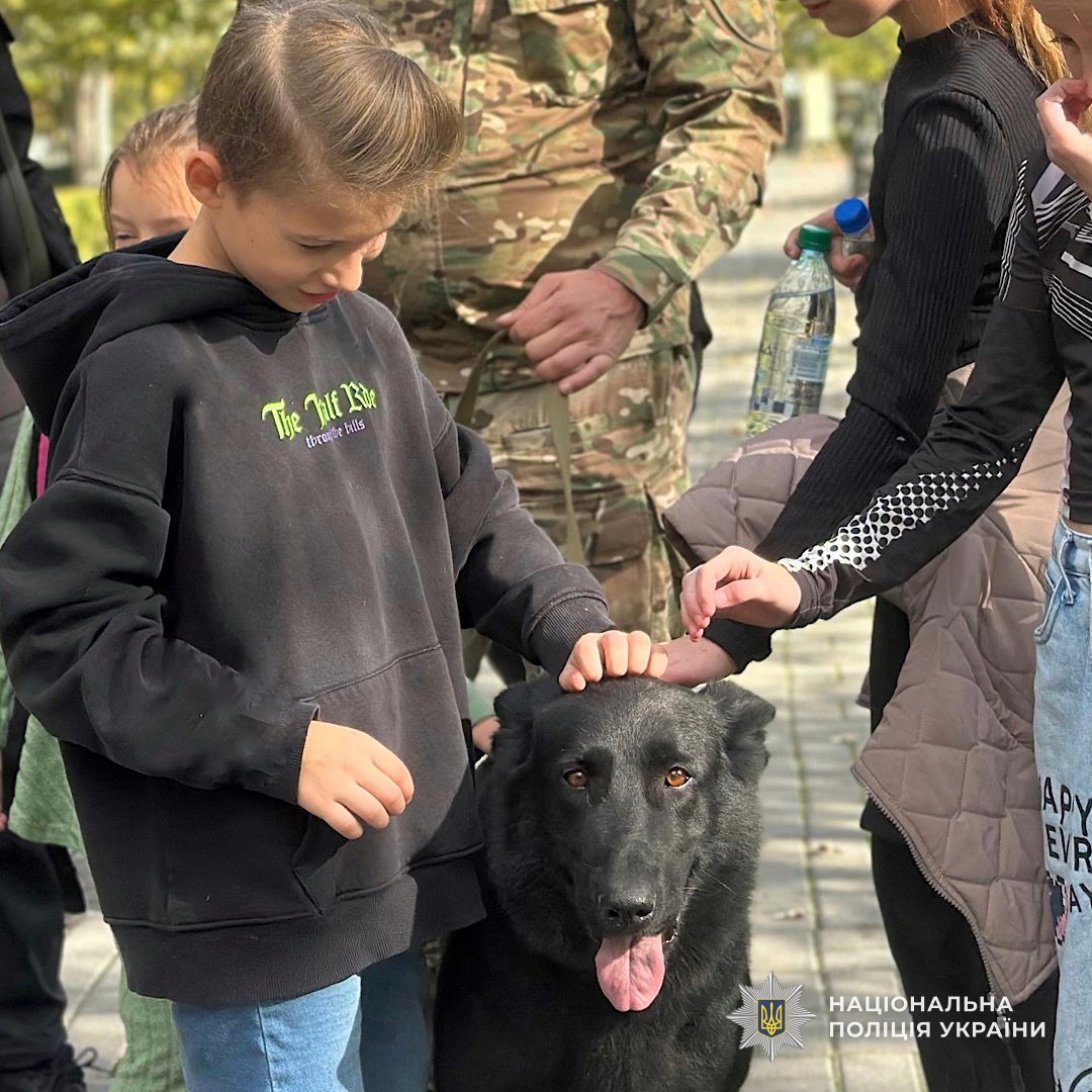 До заходу долучилися співробітники кінологічного центру ГУНП в Дніпропетровській області зі своїми вірними службовими собаками — трьома німецькими вівчарками: ніжною Альмою, ласкавим Чілі та серйозним, але добрим Більтом. Поруч із місцем проведення заходу зібралися й місцеві малюки, яких привабили службові собачки. Психологи із радістю запросили всіх охочих долучитися. Кожна дитина, яка була поруч, мала можливість поспілкуватися з кінологами, пограти з собаками та отримати заряд позитивних емоцій. Чотирилапі показали свої навички, слухняність і неабиякий інтелект, а потім із задоволенням дозволили себе погладити, пообіймати, сфотографуватися та навіть побігати разом із хлопчиками й дівчатками.
