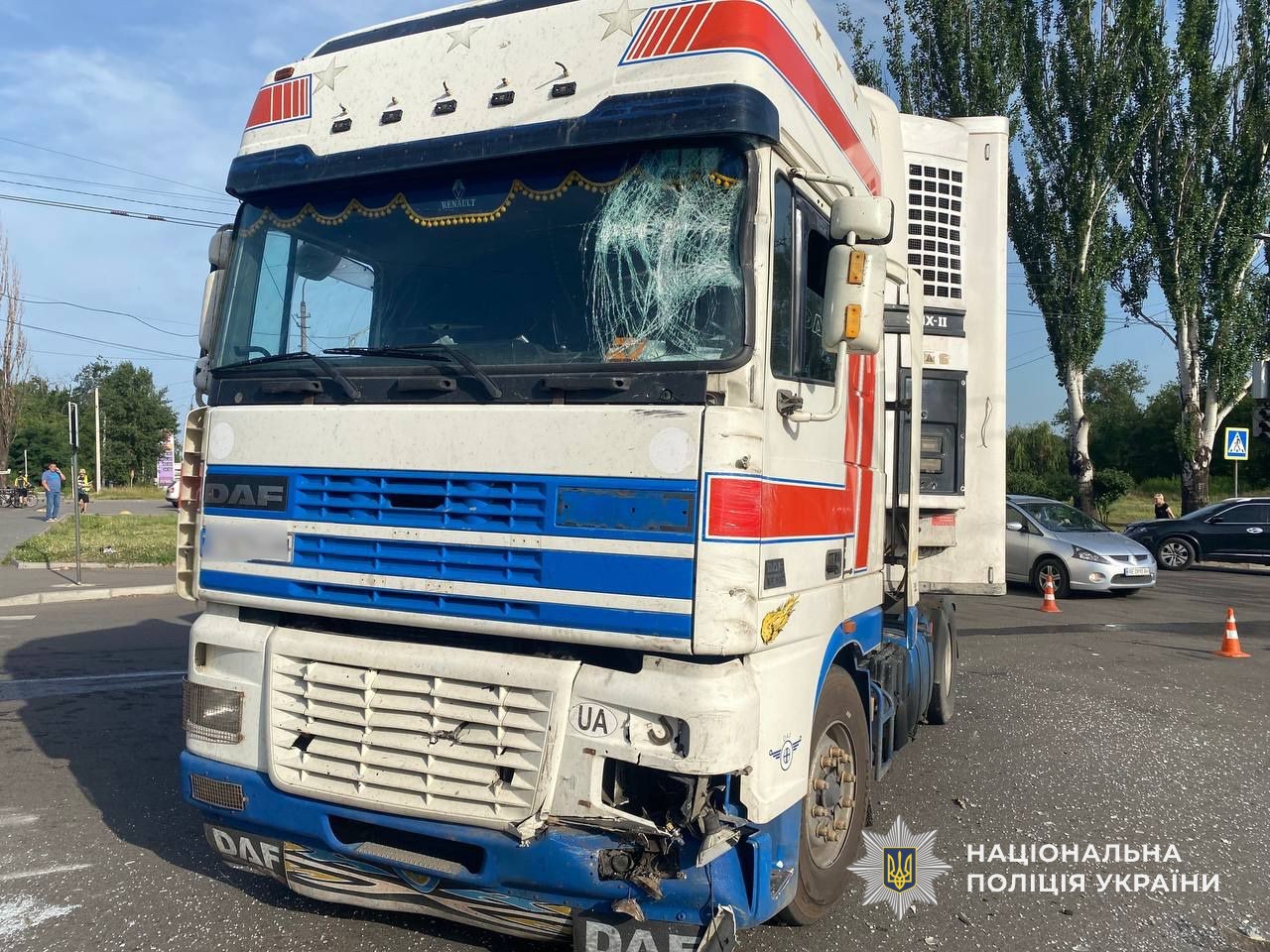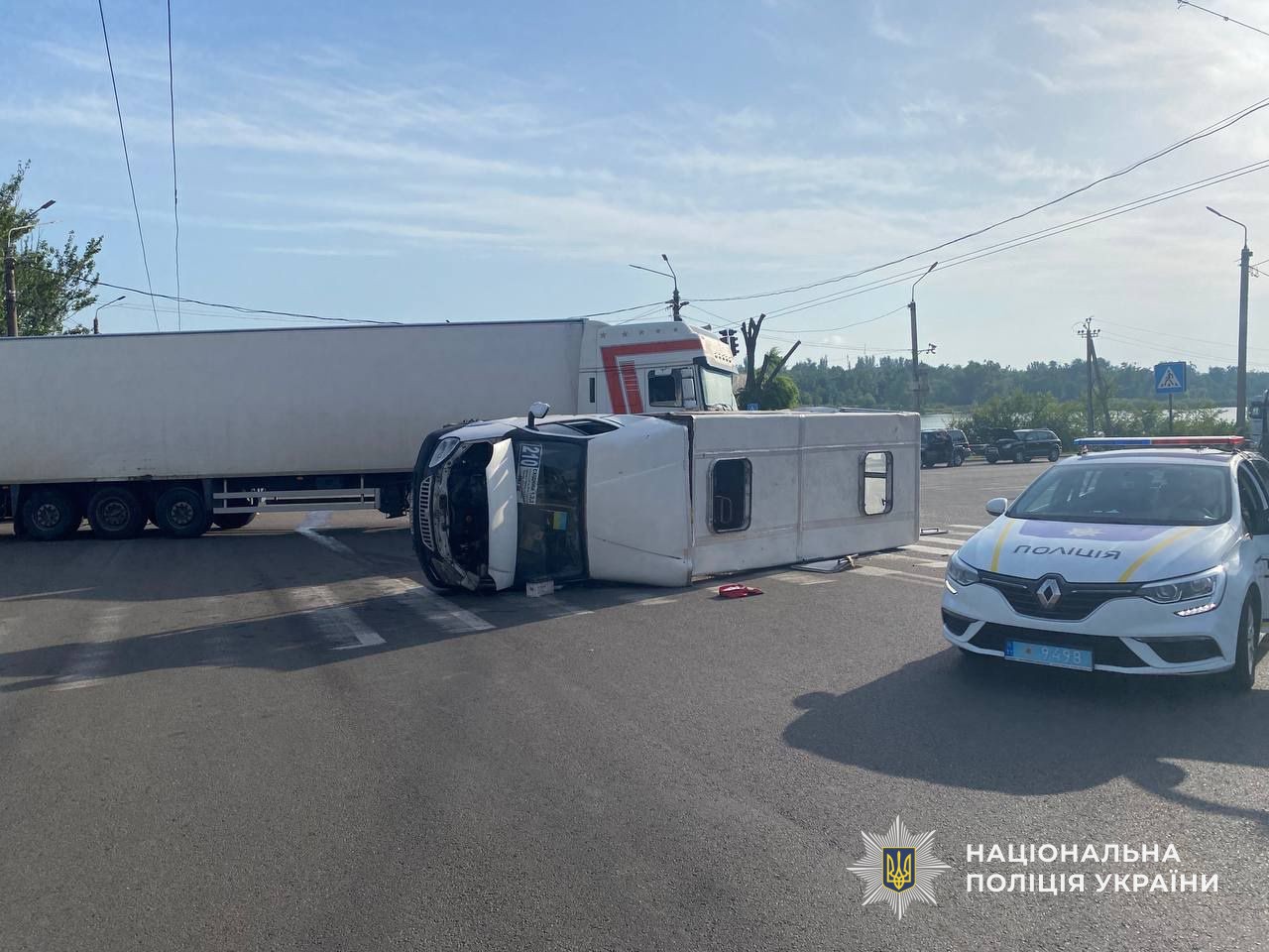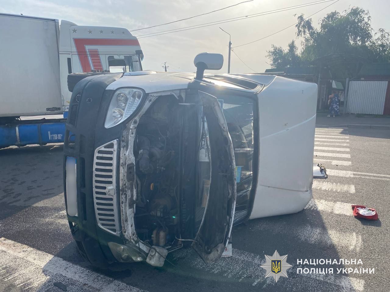 Повідомлення про дорожньо-транспортну пригоду на території Металургійного району міста до поліції надійшло 24 червня близько 6.20 ранку. Попередньо встановлено, що водій вантажного автомобіля «DAF» виїхав з другорядної дороги на головну та допустив зіткнення з маршрутним таксі, в результаті транспортний засіб перекинувся. Постраждали люди, які були в салоні автівки.