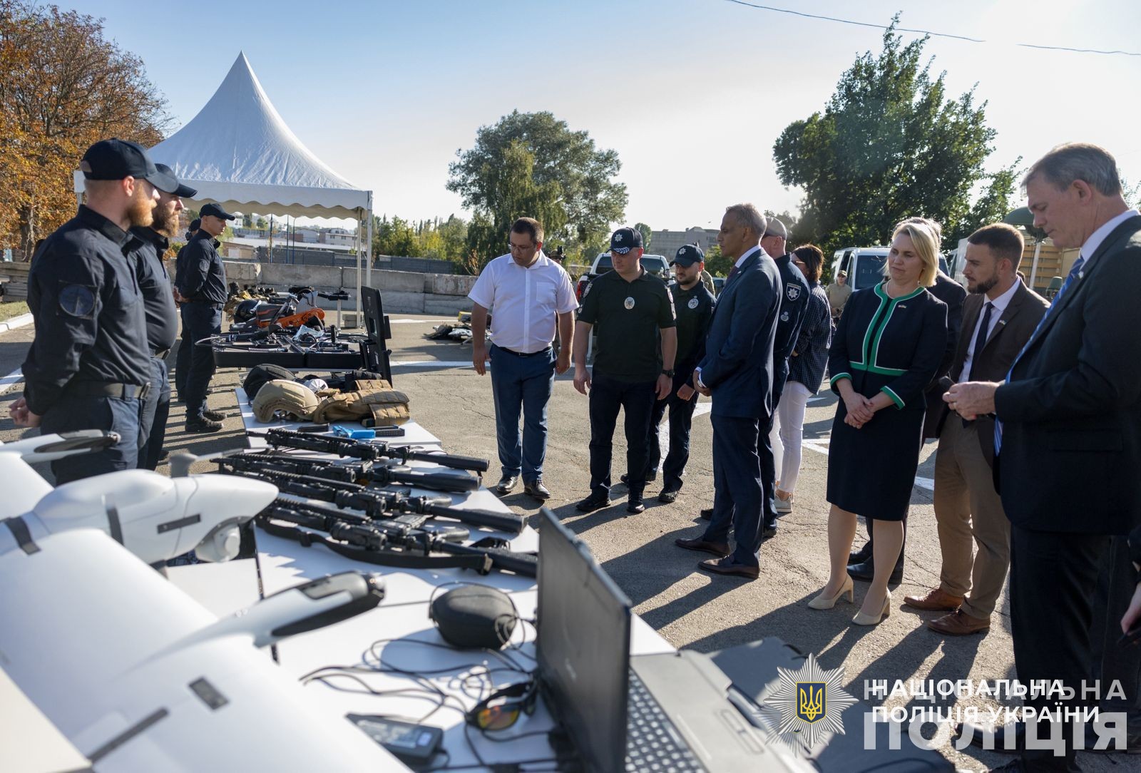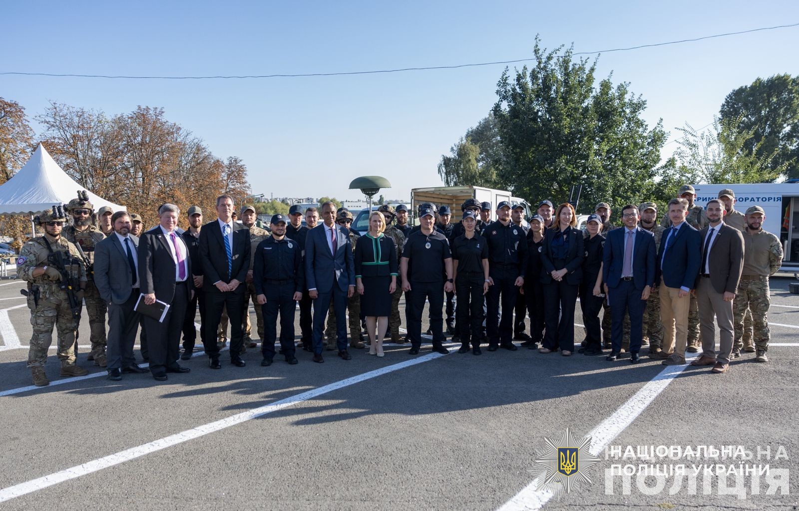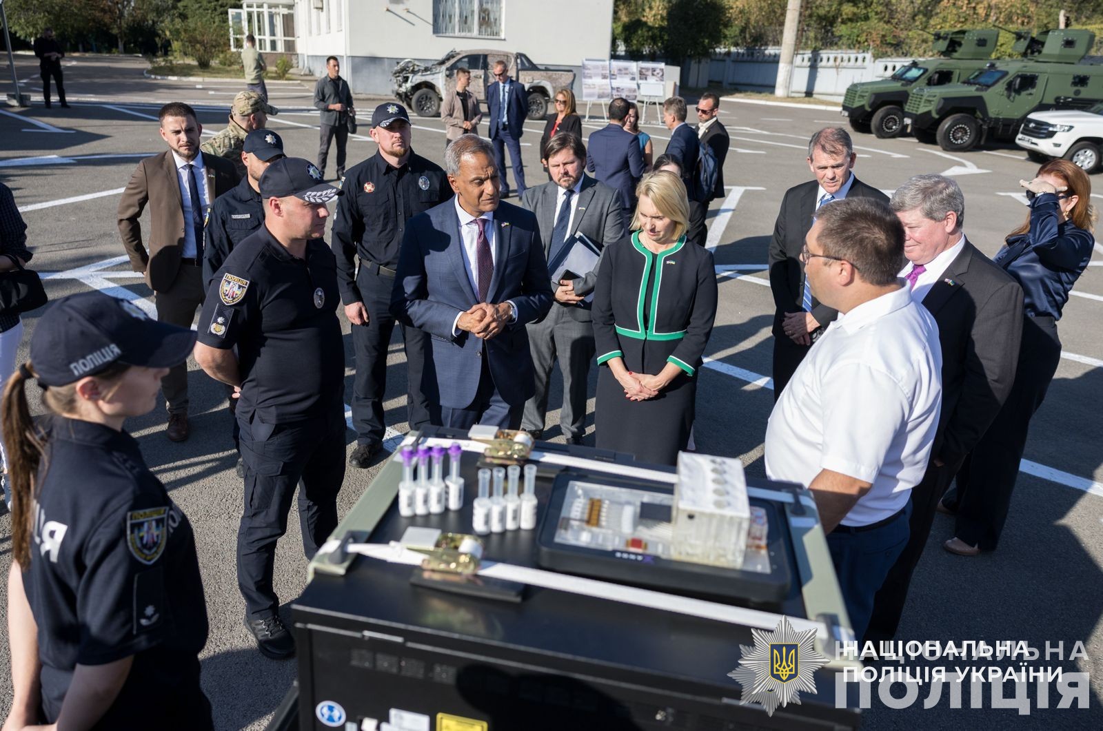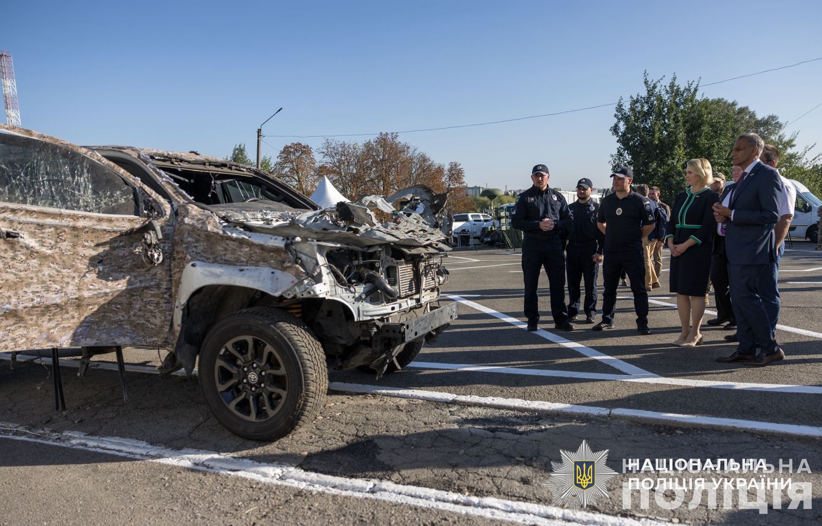 На базі Департаменту патрульної поліції Нацполу партнерам продемонстрували автомобілі та бронетехніку, криміналістичні лабораторії, роботи розмінування, дрони та інше обладнання, надане в рамках підтримки та допомоги від уряду США — U.S. Department of State: Bureau of Intl Narcotics & Law Enforcement (INL) — те, що допомагає рятувати та зберігати життя. Серед техніки — і уражені ворогом авто.