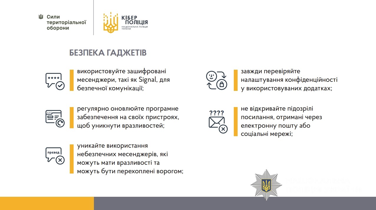 Закликаємо всіх захисників і захисниць України дотримуватися рекомендацій кіберполіції та сил ТрО ЗСУ для забезпечення своєї кібербезпеки.
