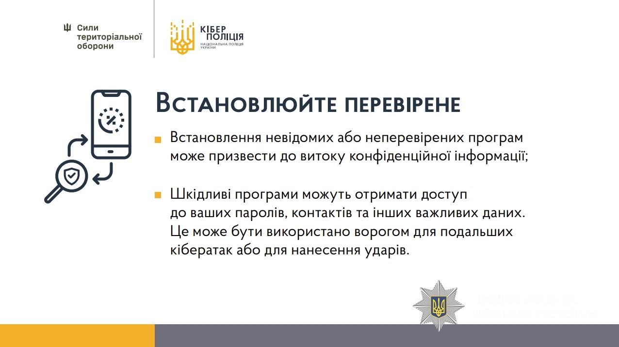 - шкідливі програми можуть отримати доступ до ваших паролів, контактів та інших важливих даних, що може бути використано ворогом для подальших кібератак або нанесення ударів.