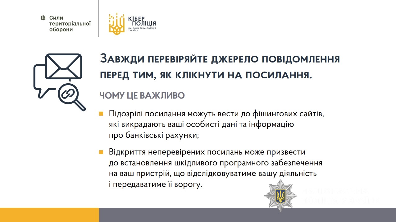 - завжди перевіряйте джерело повідомлення перед тим, як клікнути на посилання.