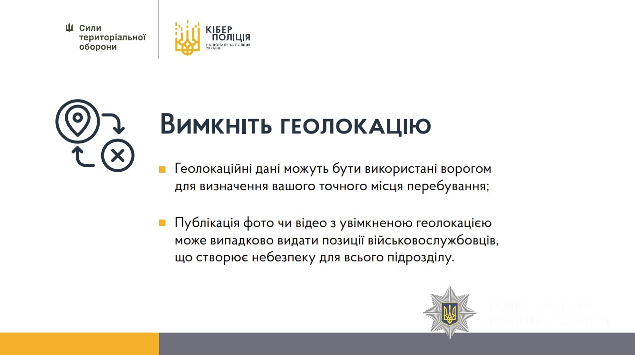 - публікація фото чи відео з увімкненою геолокацією може випадково видати позиції військовослужбовців, що створює небезпеку для всього підрозділу.