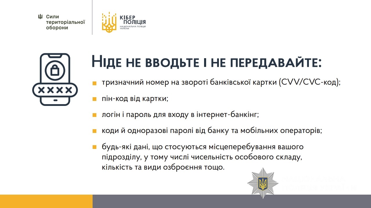 Для уникнення таких загроз не передавайте стороннім особам та не вводьте у різноманітних анкетах:
