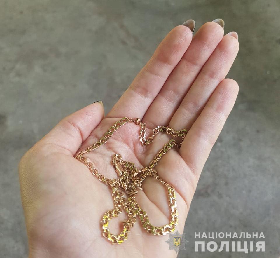 30-річний чоловік зізнався правоохоронцям у скоєному, також у нього вилучили викрадений золотий ланцюжок з хрестиком. Чоловіку загрожує кримінальна відповідальність за ст. 186 Кримінального кодексу України (грабіж), що передбачає покарання у вигляді позбавлення волі на строк до 6 років.