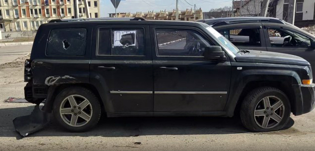 «У нас на кожному автомобілі з чотирьох сторін на А4 був напис «Діти». Я отримав кульове поранення в ліве плече та осколкове поранення лівої кісті. 5-річний син – осколкове лівої гомілки, дружина також поранена. Ми були в автомобілі, потім вони сказали, щоб, хто живий, виходили. Вийшла дружина з однорічною дитиною на руках», – розповів водій авто «Джип Патріот» Андрій.