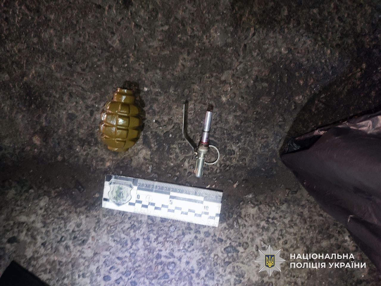 Правоохоронці перевірили документи у водія. Під час огляду транспортного засобу вони виявили наркотичні речовини вагою приблизно 200 г, гранату Ф-1 та запал до неї. Для з’ясування обставин та документування злочину на місце прибула слідчо-оперативна група. Вилучені наркотики та боєприпас вилучили та направили на експертне дослідження.
