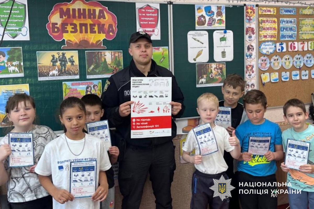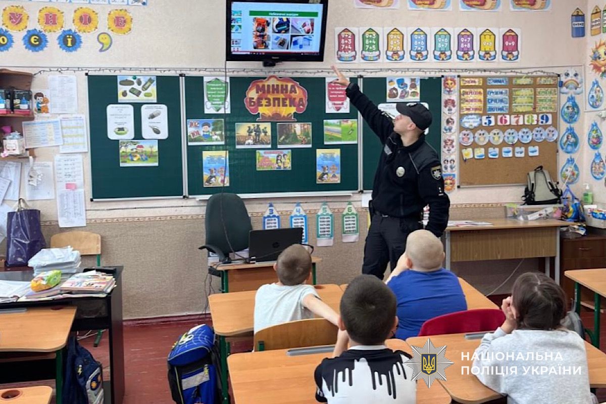 Під час заняття поліцейський розповів дітям, що таке міни та інші небезпечні предмети, як вони виглядають і чому їх не можна чіпати. Учні дізналися, що робити у разі знаходження підозрілого предмету: не торкатися, відійти якомога далі й повідомити дорослим та до поліції.