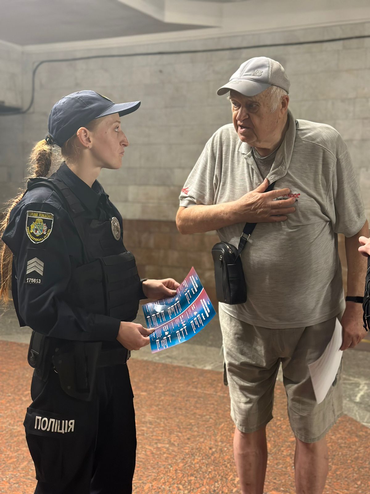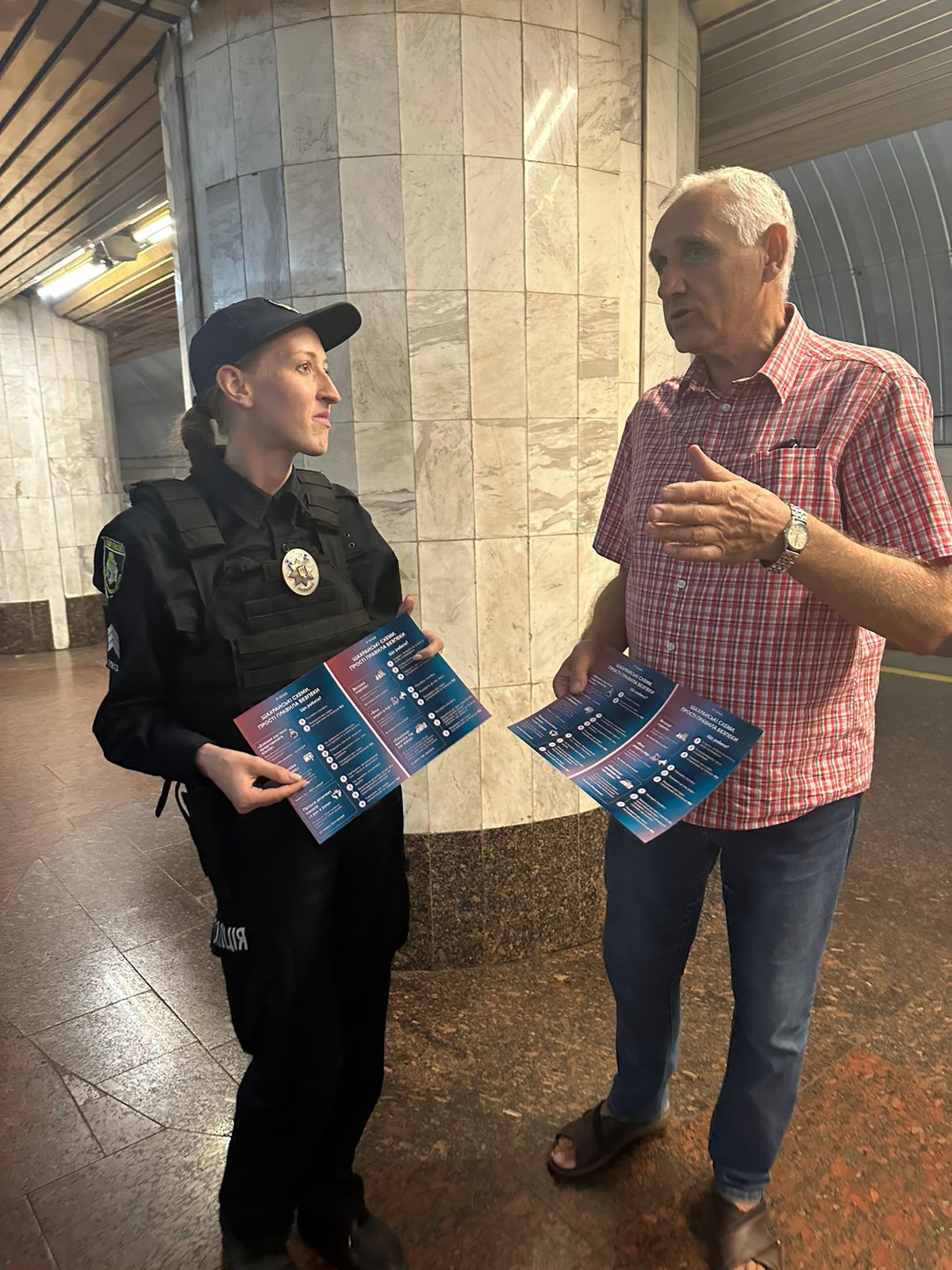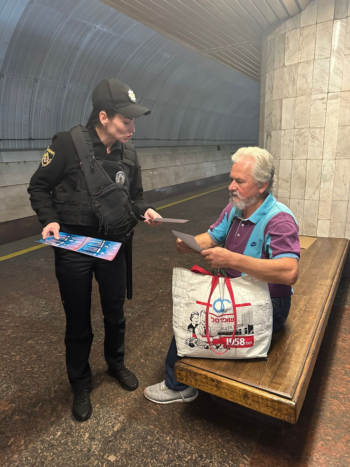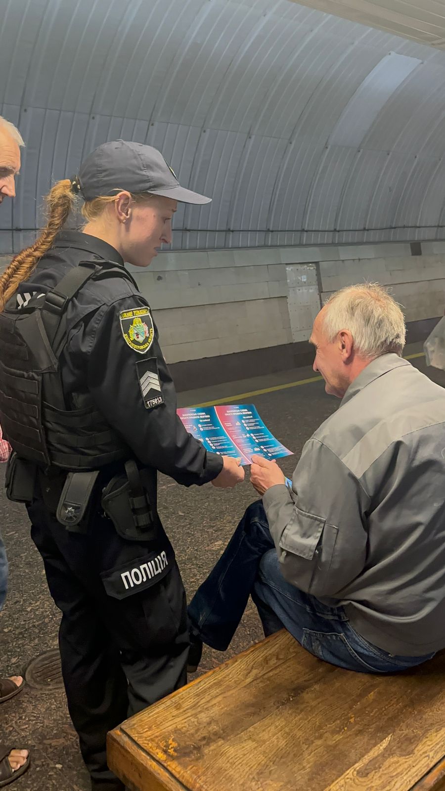 У пасажирських зонах та на станціях метро правоохоронці спілкуються з громадянами та попереджають їх про злочинні схеми аферистів. Також наводять приклади зі службової практики.