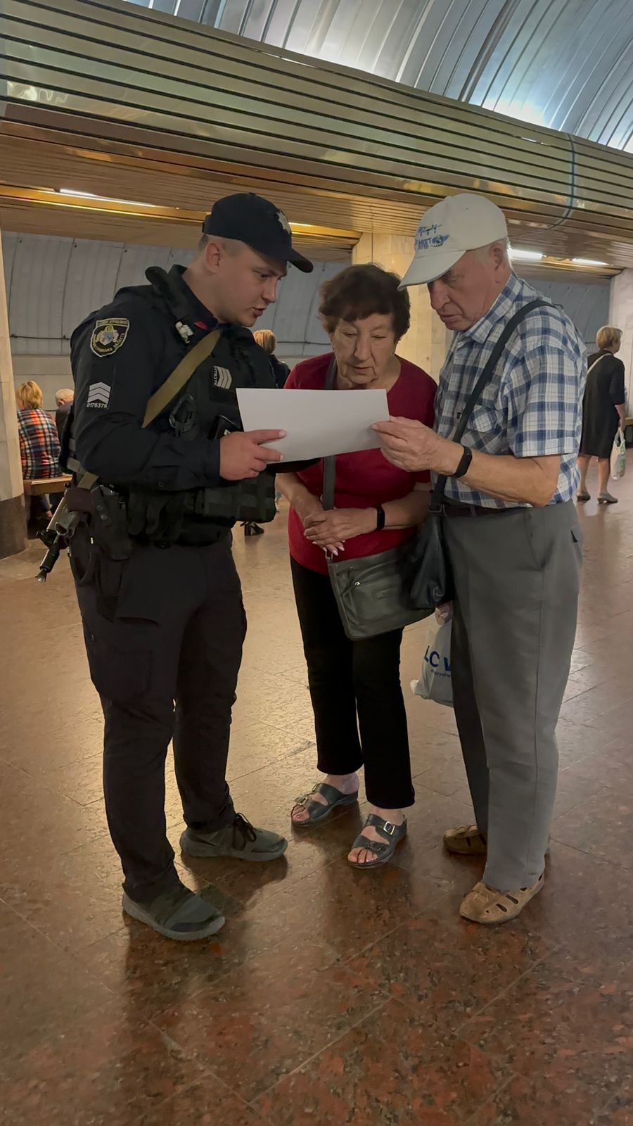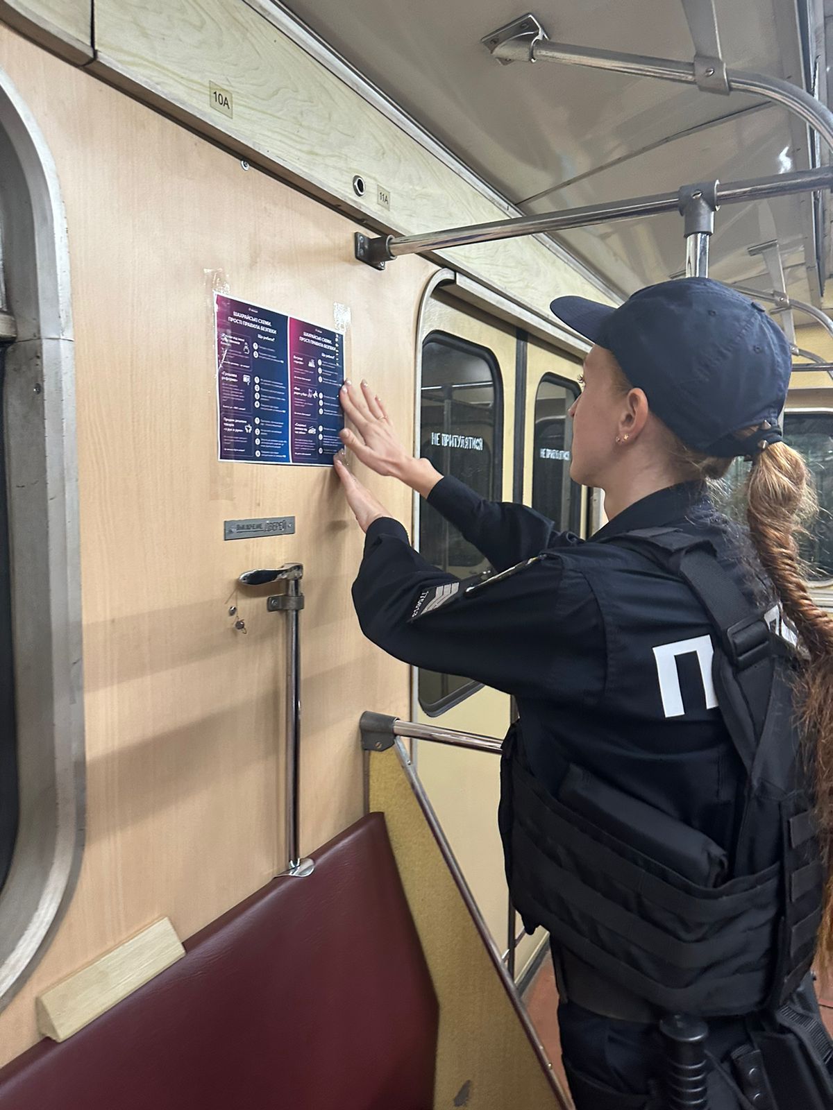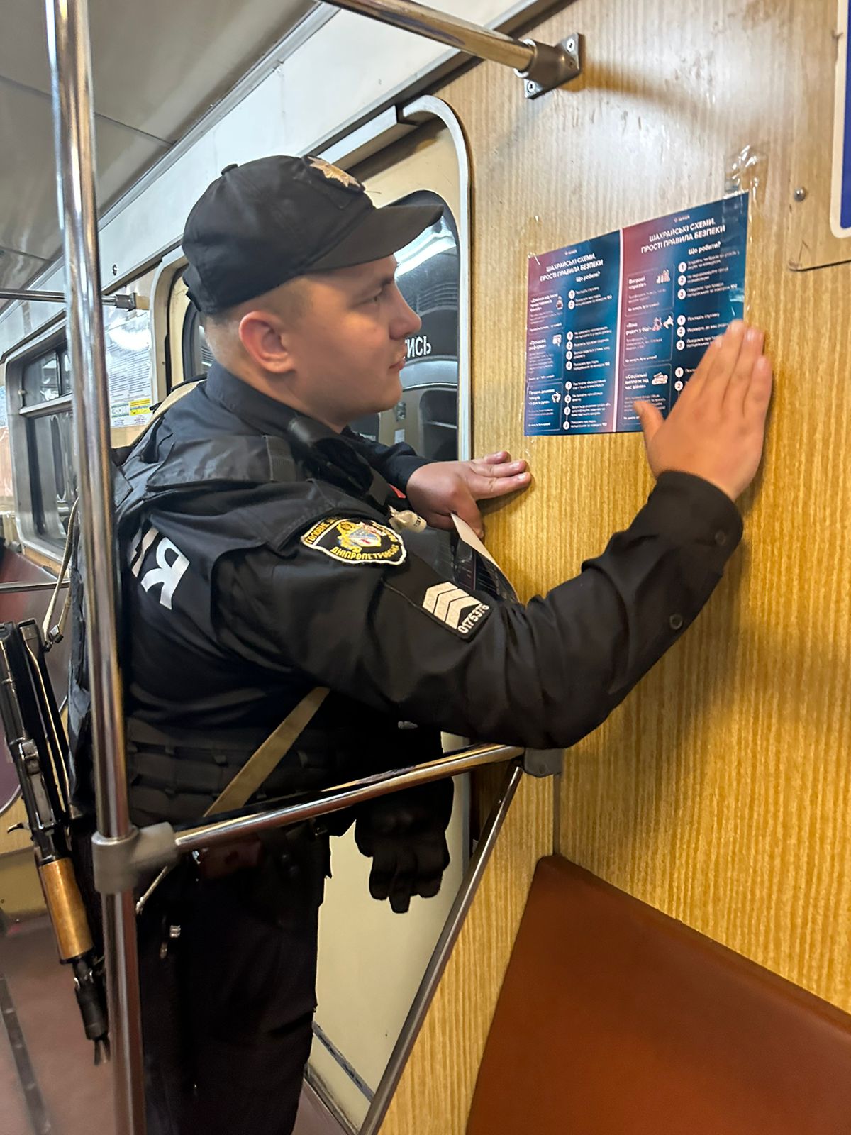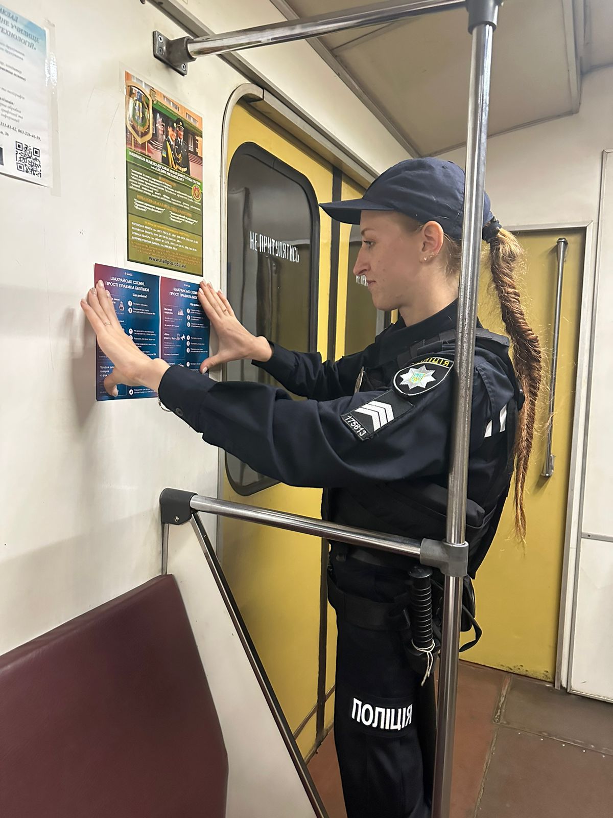 У пасажирських зонах та на станціях метро правоохоронці спілкуються з громадянами та попереджають їх про злочинні схеми аферистів. Також наводять приклади зі службової практики.