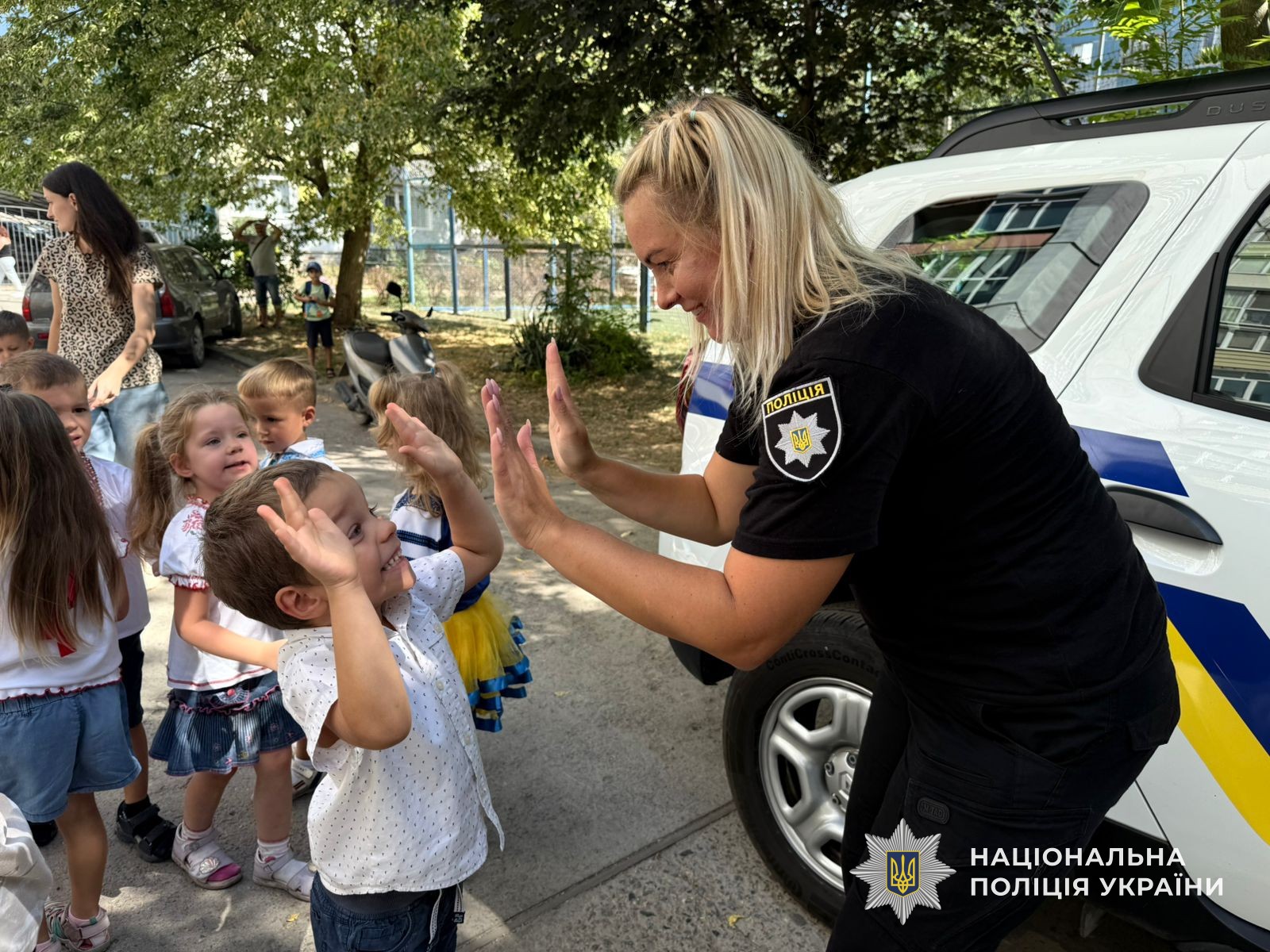 Не менший інтерес викликало знайомство зі службовим автомобілем поліції. Діти приміряли елементи амуніції, почули, як працюють спецсигнали, дізналися більше про професію поліцейського та повторили правила безпеки.