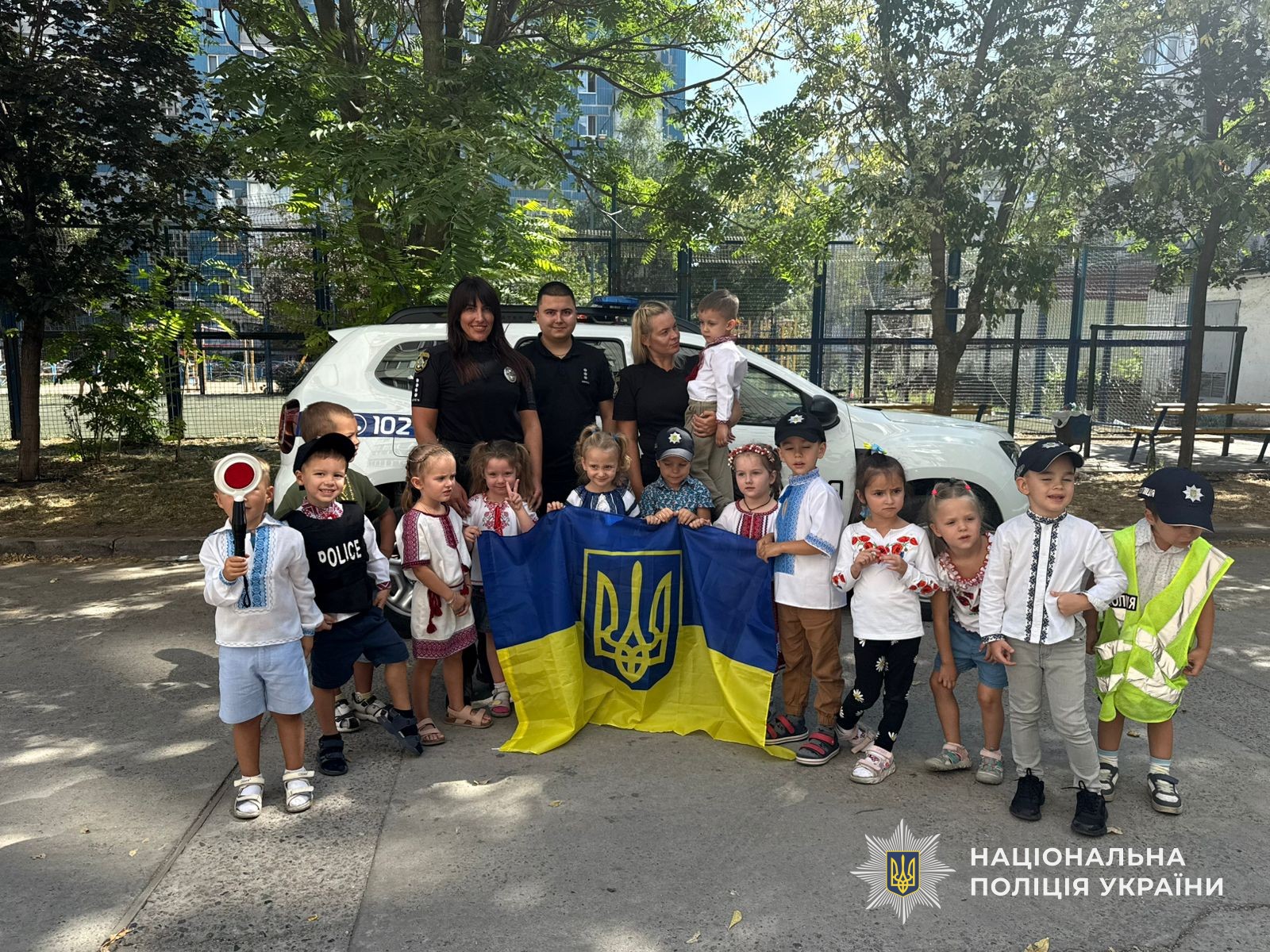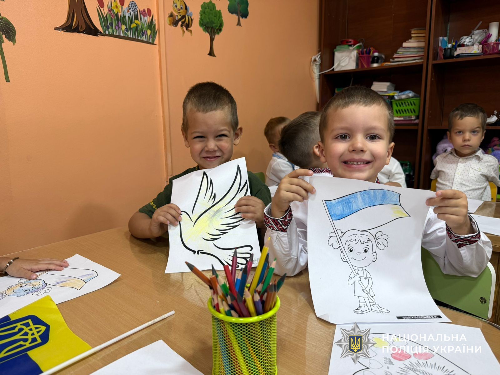 Старший інспектор з дотримання прав людини разом із поліцейським офіцером громади розповіли дітям про державні символи — прапор, герб та гімн України. Особливу увагу приділили значенню жовто-блакитного стяга як символу миру і свободи.