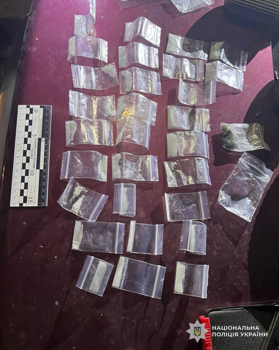Чоловік перевозив в авто майже 30 сліп-пакетиків з кристалічною речовиною, пакетики з рослинною речовиною наркотичного походження, електроні ваги, пістолет та два магазини до нього.
