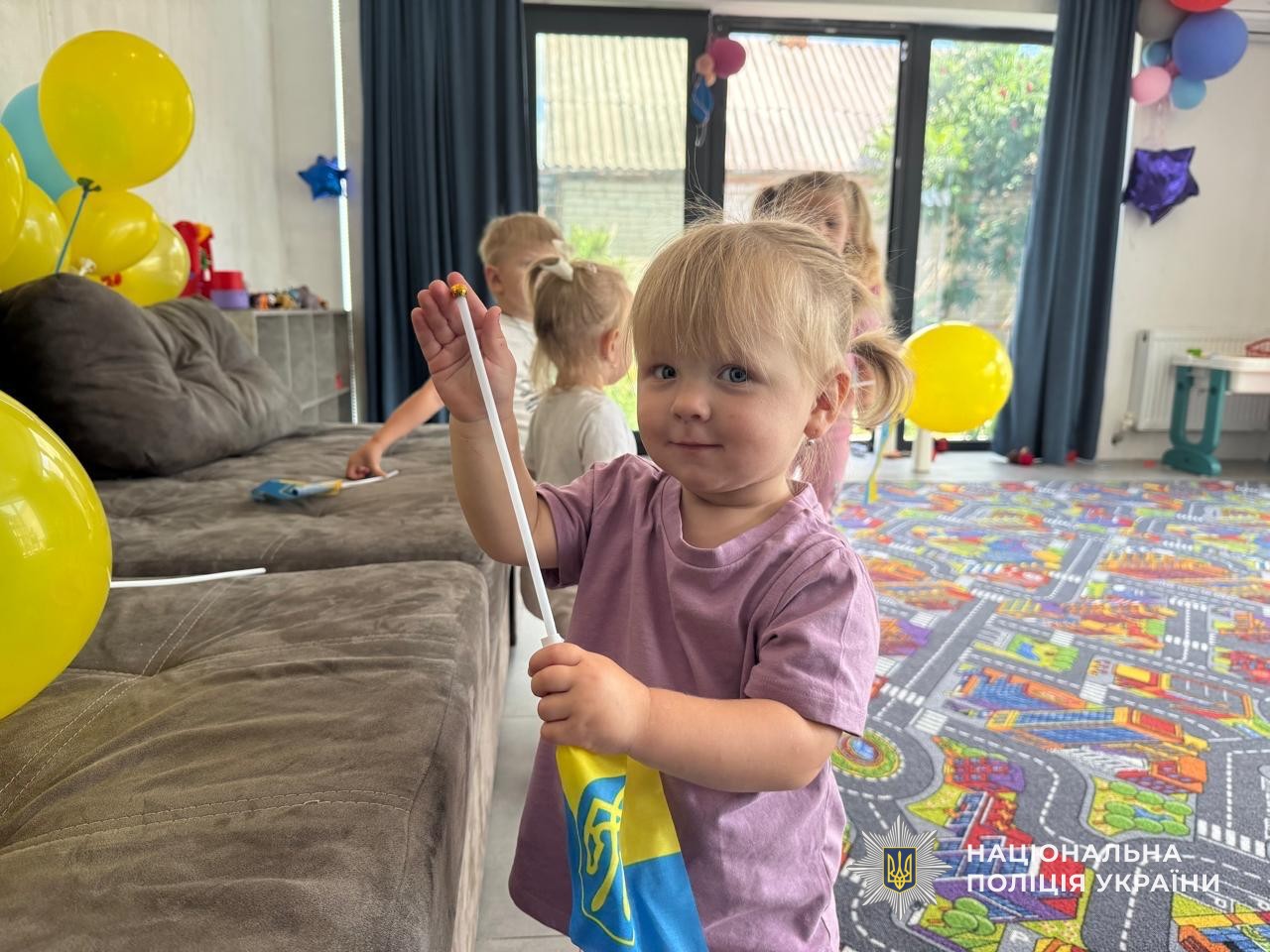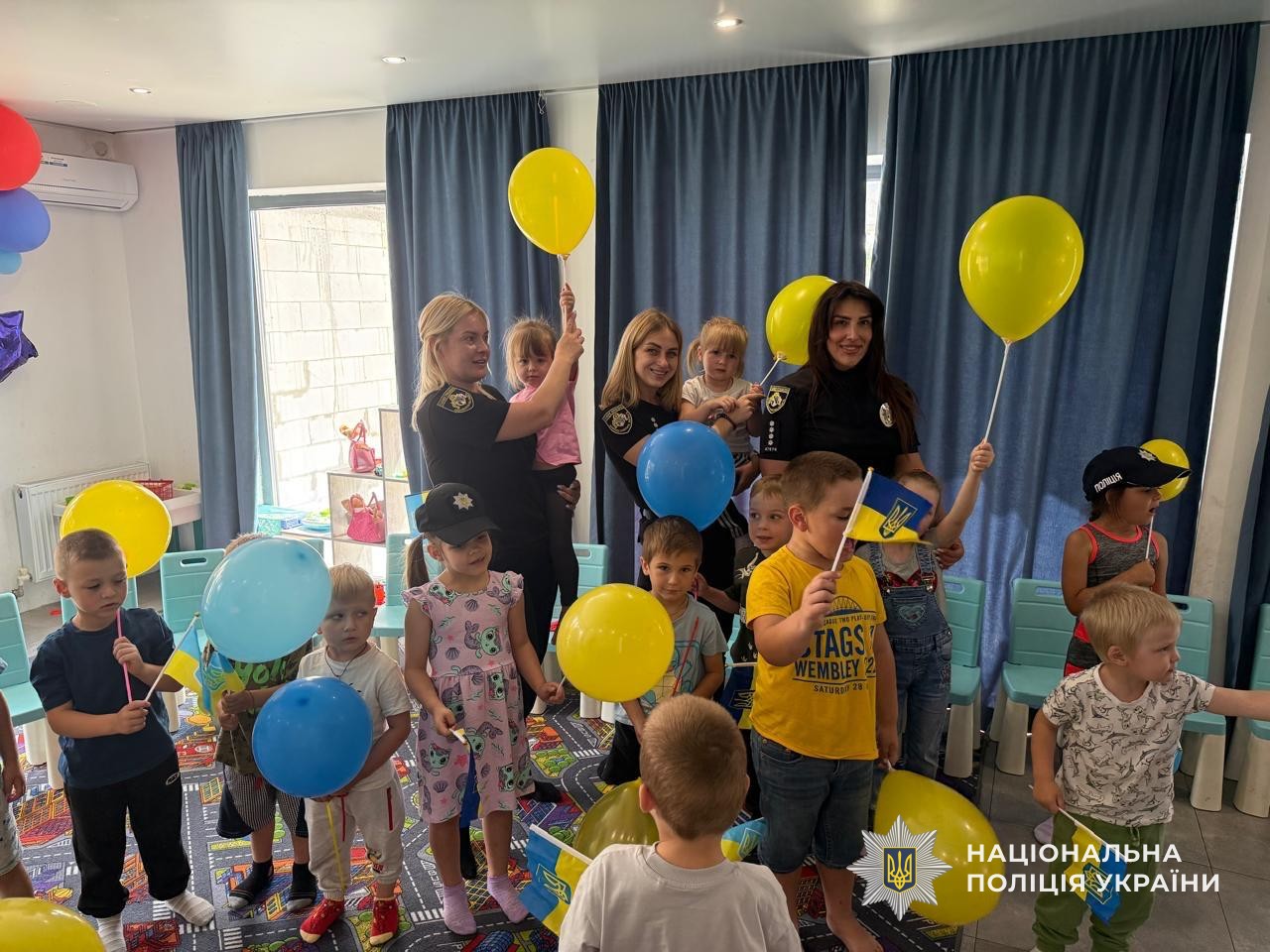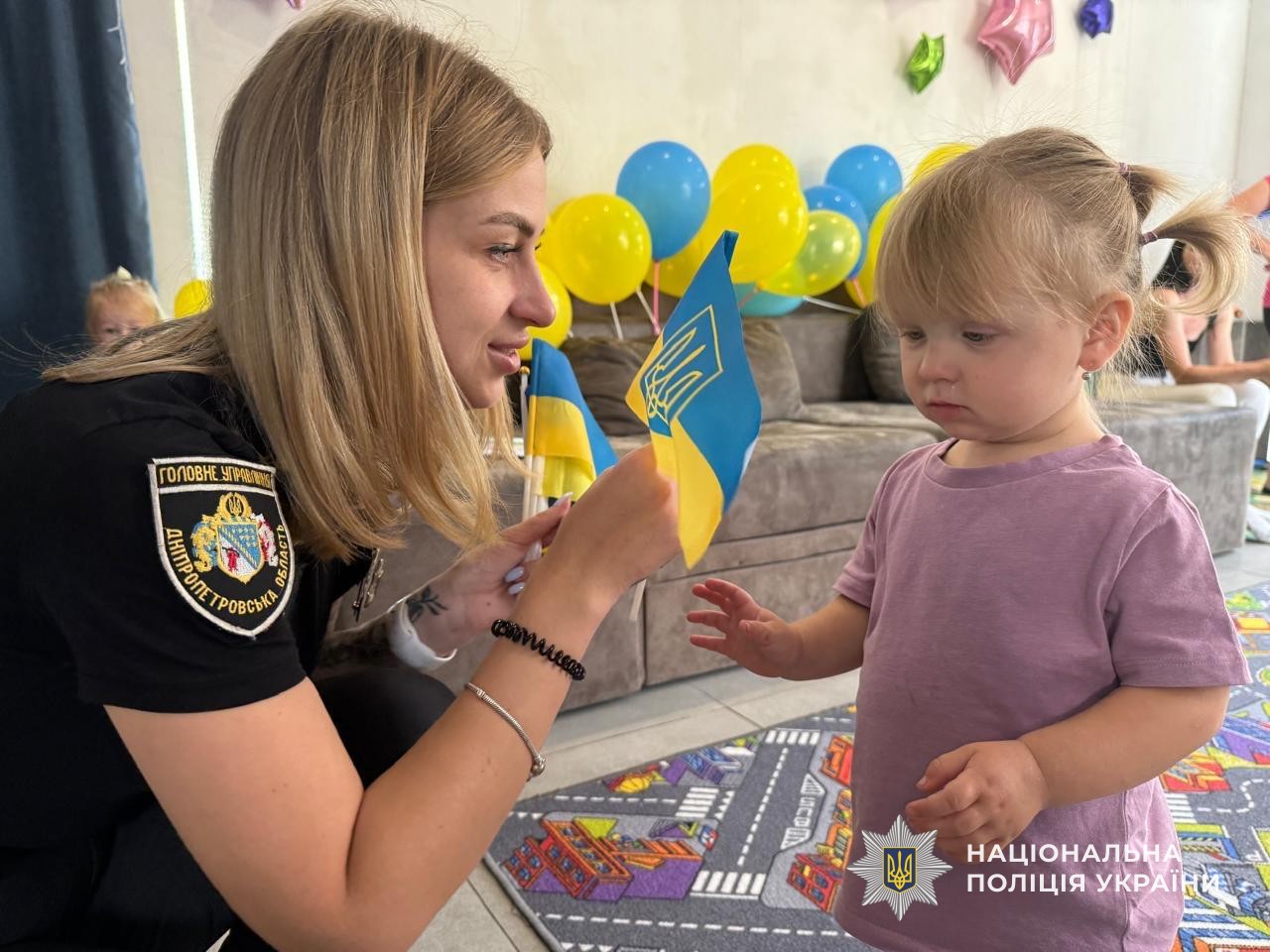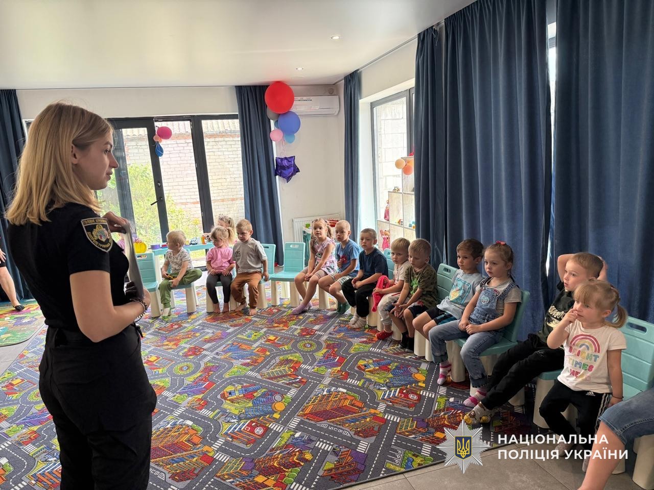 Окрім цього, правоохоронці розповіли дітям про важливість дотримання правил безпеки на дорозі, пояснили, як правильно переходити вулицю, для чого потрібні світлофори та дорожні знаки. Малюки із захопленням грали в тематичні ігри та ділилися своїми знаннями. А на завершення зустрічі кожен маленький учасник отримав у подарунок яскраву кульку та прапорець України.