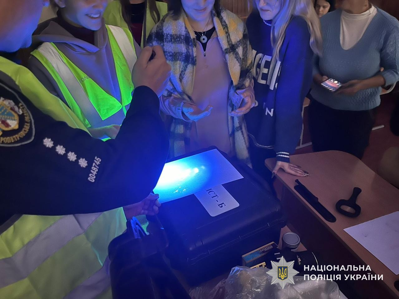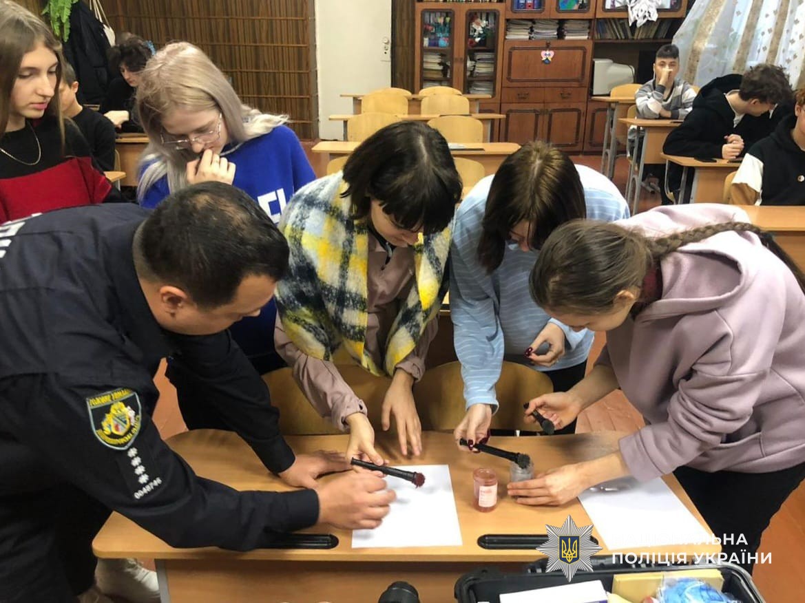 Начальник сектору криміналістичного забезпечення Павло Водолазський розповів дітям про тонкощі роботи зі слідами злочину на місці події та ознайомив з основними видами експертиз. Зі своєї криміналістичної лабораторії він продемонстрував все необхідне, щоб зняти відбитки пальців.