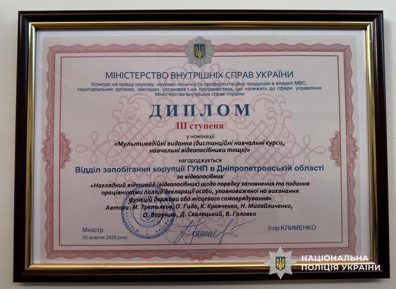 Відділ запобігання корупції Головного управління Національної поліції в Дніпропетровській області взяв участь у конкурсі на кращу наукову, науково-технічну та профорієнтаційну продукцію серед підрозділів, установ та закладів, що належать до сфери управління Міністерства внутрішніх справ України.