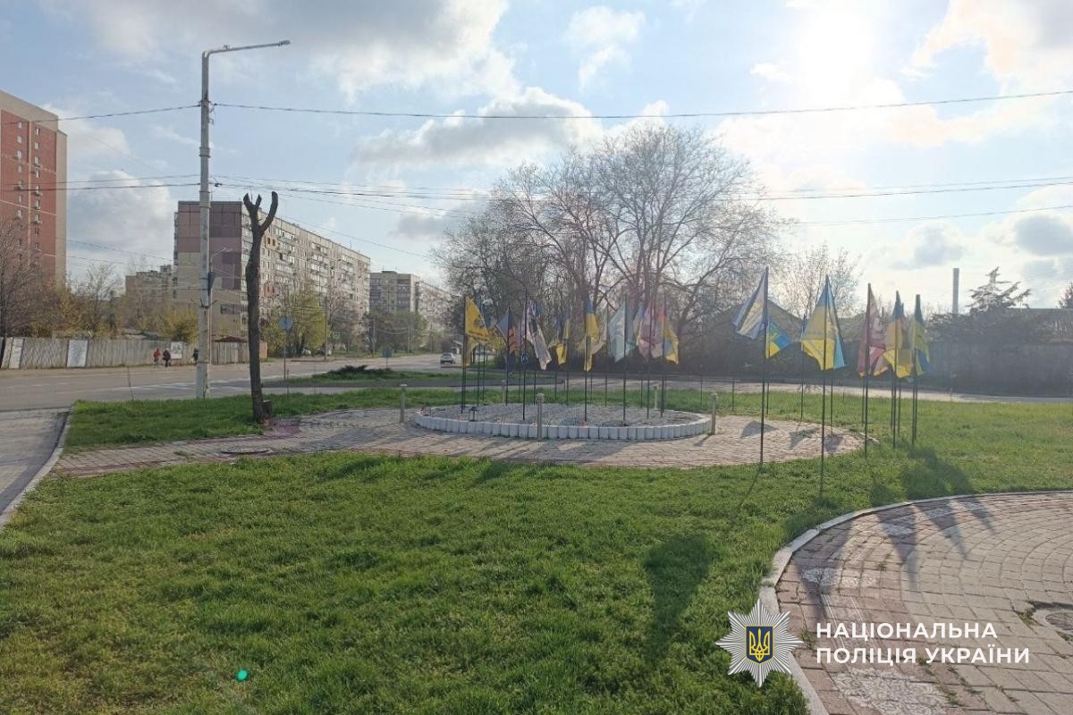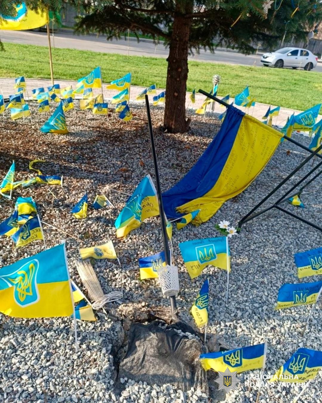 Зловмисник пошкодив встановлені прапори України, флагшток, викрав вази та вирвав квіти з місця вшанування пам’яті.