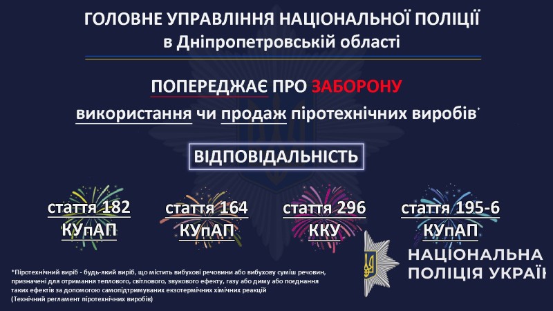 Звертаємося до громадян не порушувати норми законодавства. Пам'ятайте - використання та розповсюдження більшості салютів, феєрверків та петард - заборонено Законом.