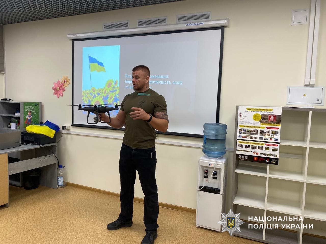 Особливу увагу школярів привернула розповідь ветерана, який поділився власним досвідом служби, цінностями та прикладами з життя. Він також показав сучасні технології, що застосовуються на фронті, зокрема дрони, та розповів про їхню роль у виконанні бойових завдань.