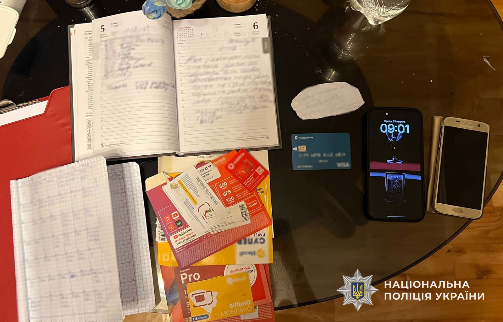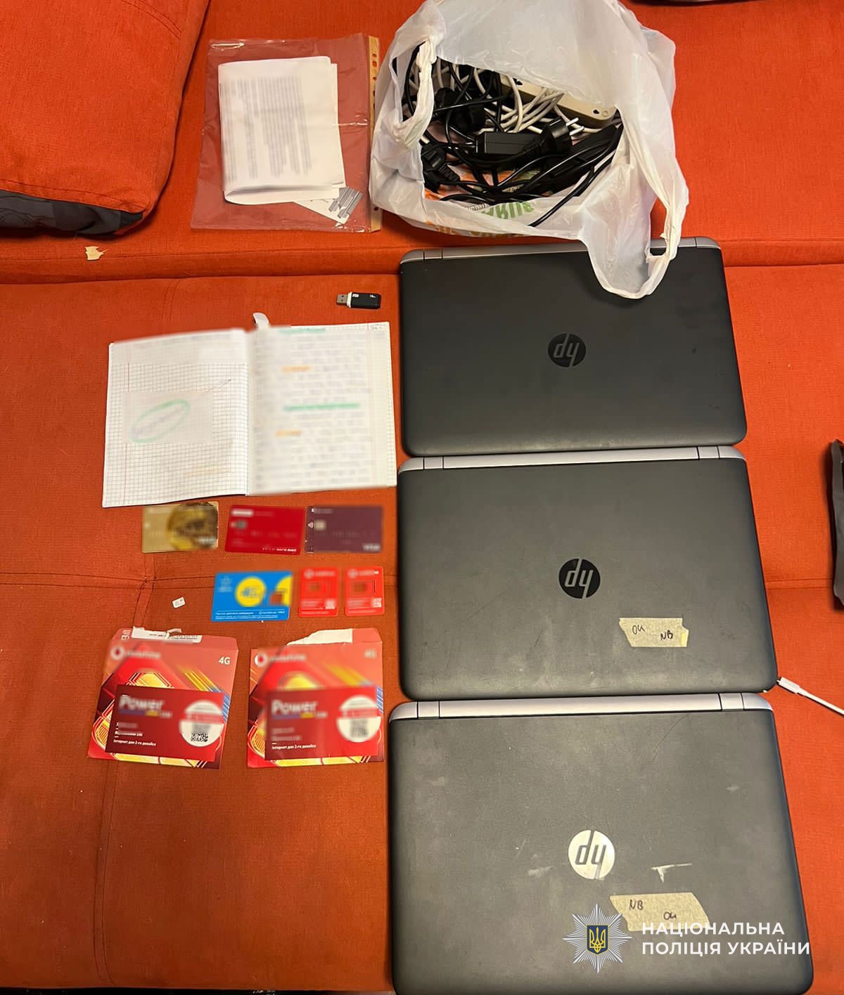 Поліцейські в рамках розслідування провели обшуки та вилучили комп’ютерну техніку, банківські картки, телефони, SIM-картки та зошити з чорновими записами, що підтверджують злочинну діяльність фігурантів.