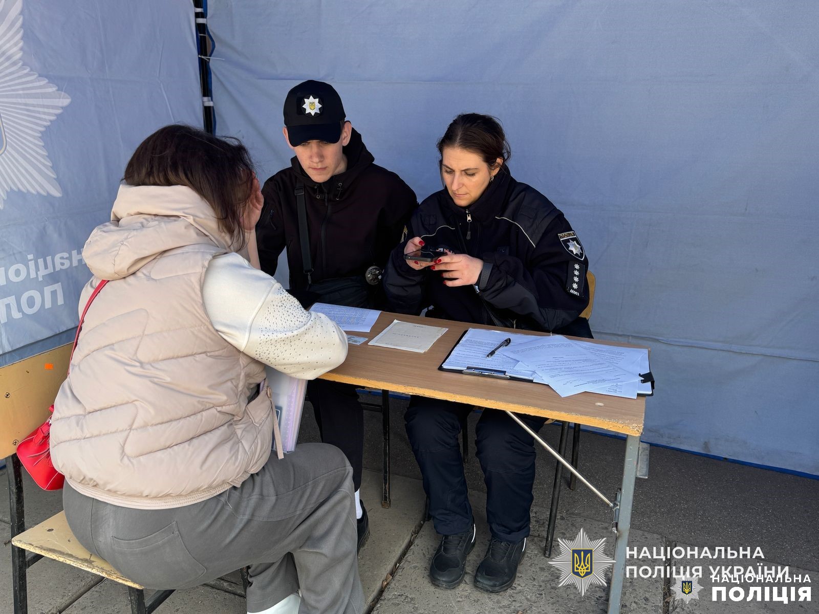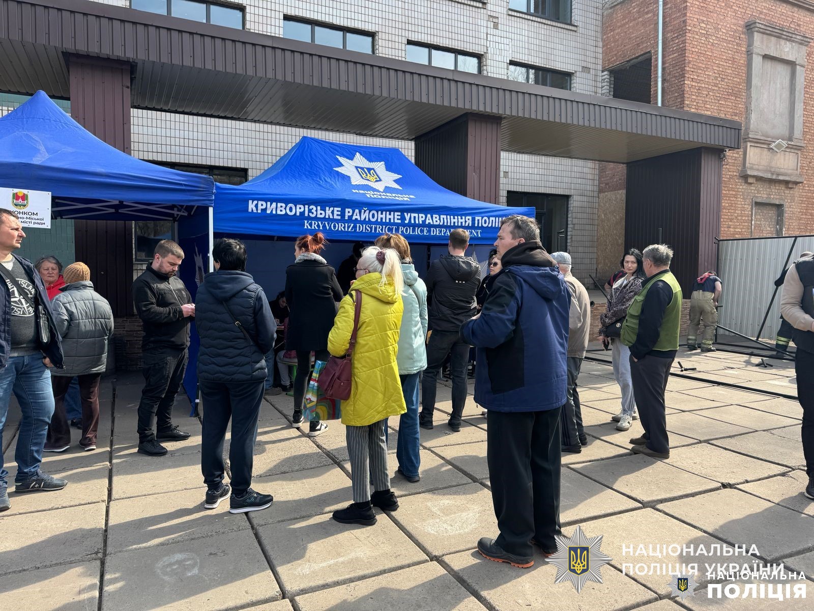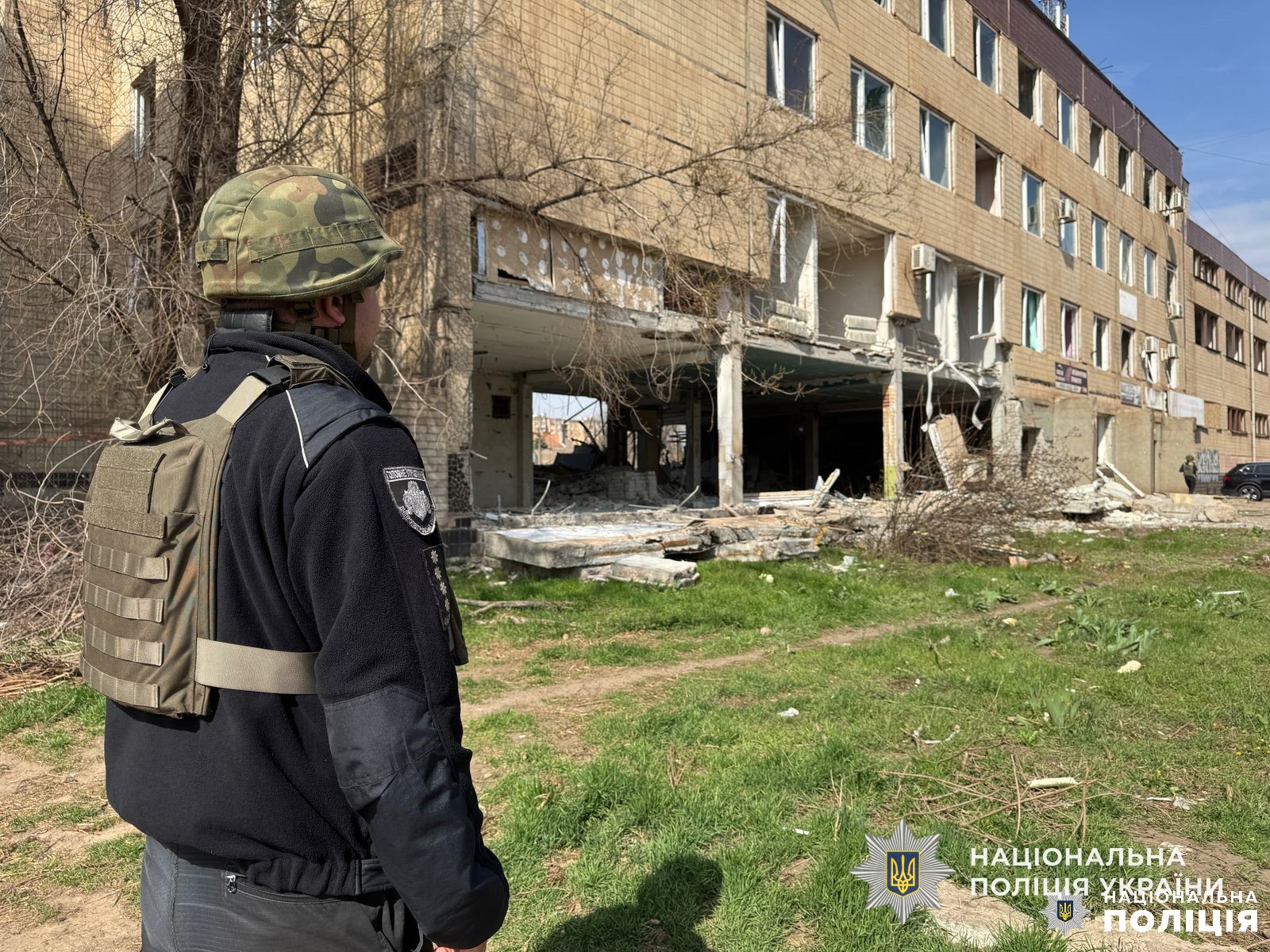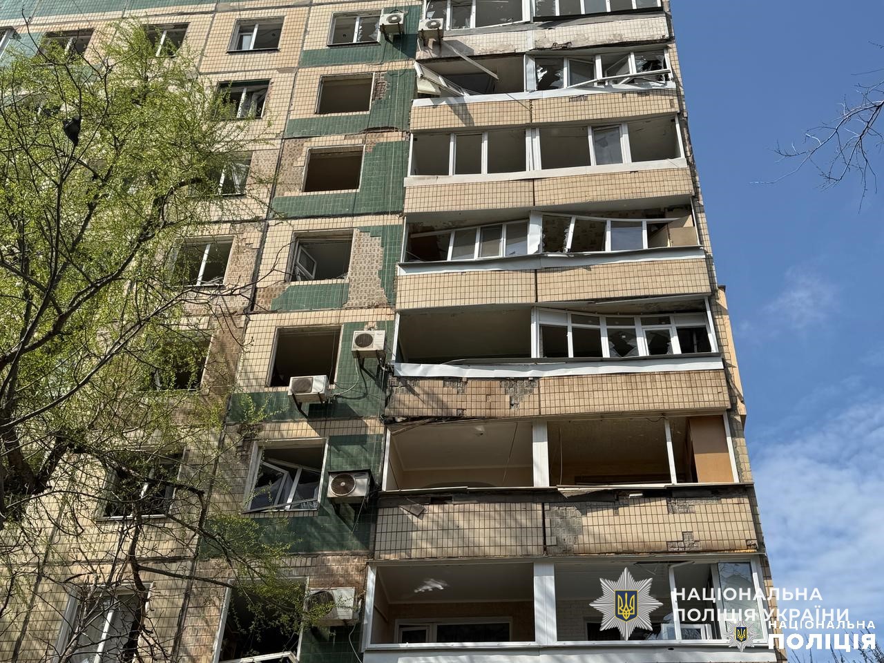 Поряд з місцем влучання розгорнуто мобільний штаб поліції для прийому звернень від постраждалих громадян.