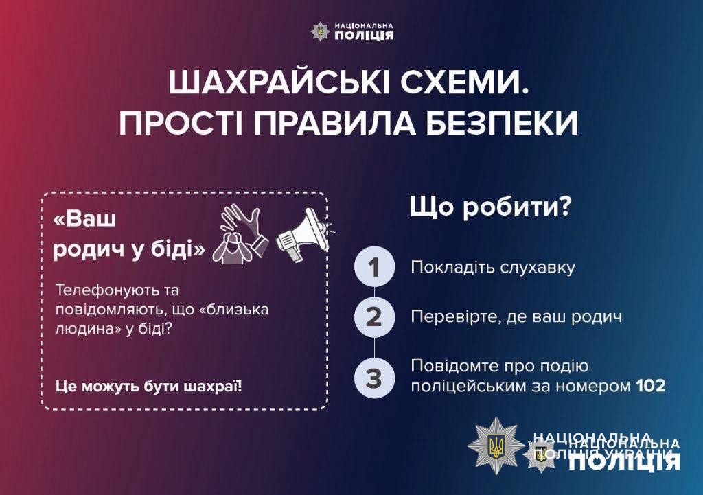 У січні до поліції звернулась місцева мешканка, яка стала жертвою шахрайської схеми. Потерпілій зателефонувала невідома жінка, представилася працівницею поліції та повідомила, що її доньку затримали за вчинення злочину. А щоб звільнити дитину, потрібно негайно перерахувати гроші на банківську картку. Довірлива потерпіла переказала 50 тисяч гривень на рахунок шахрайки, після чого дзвінок обірвався.