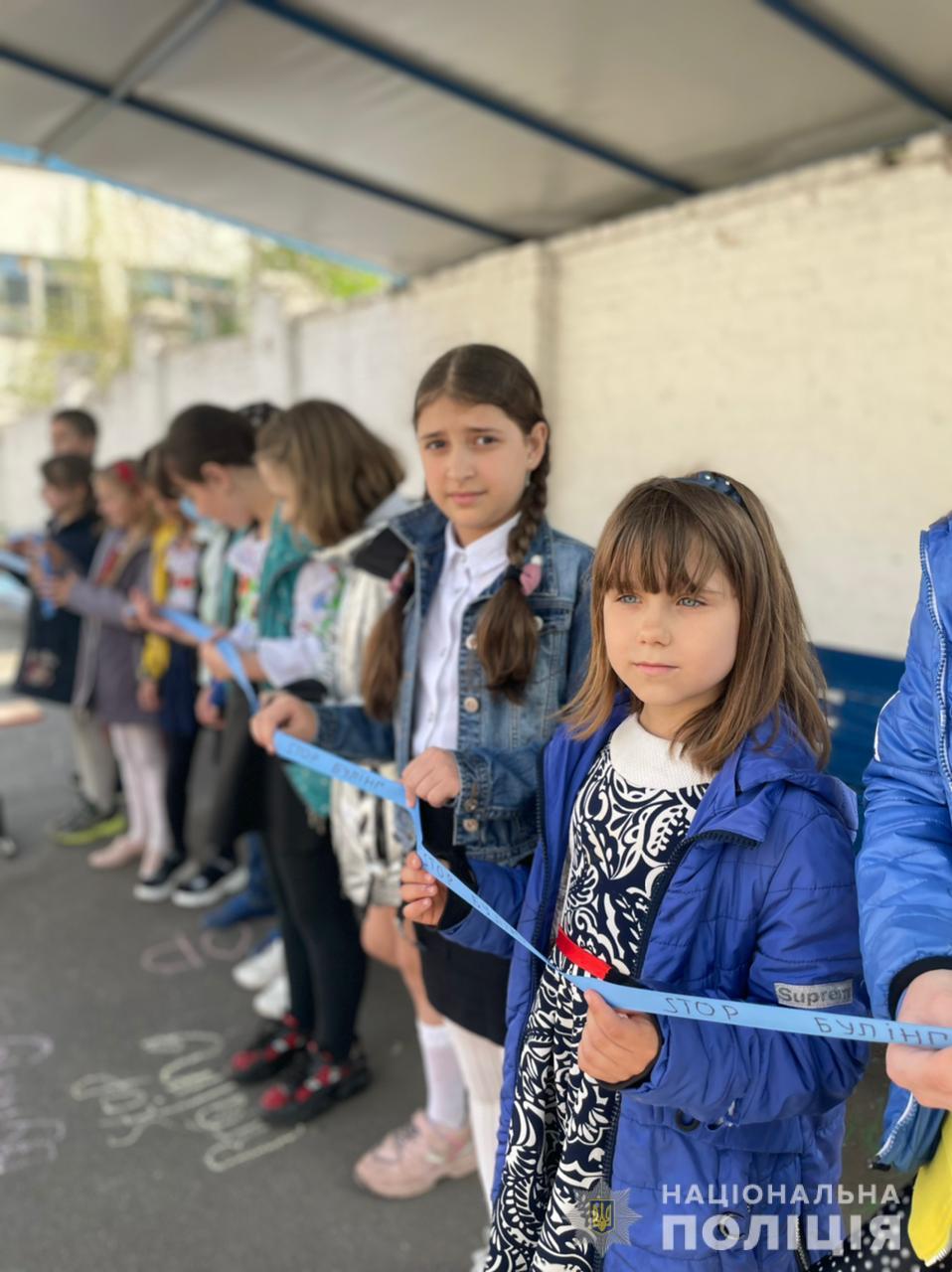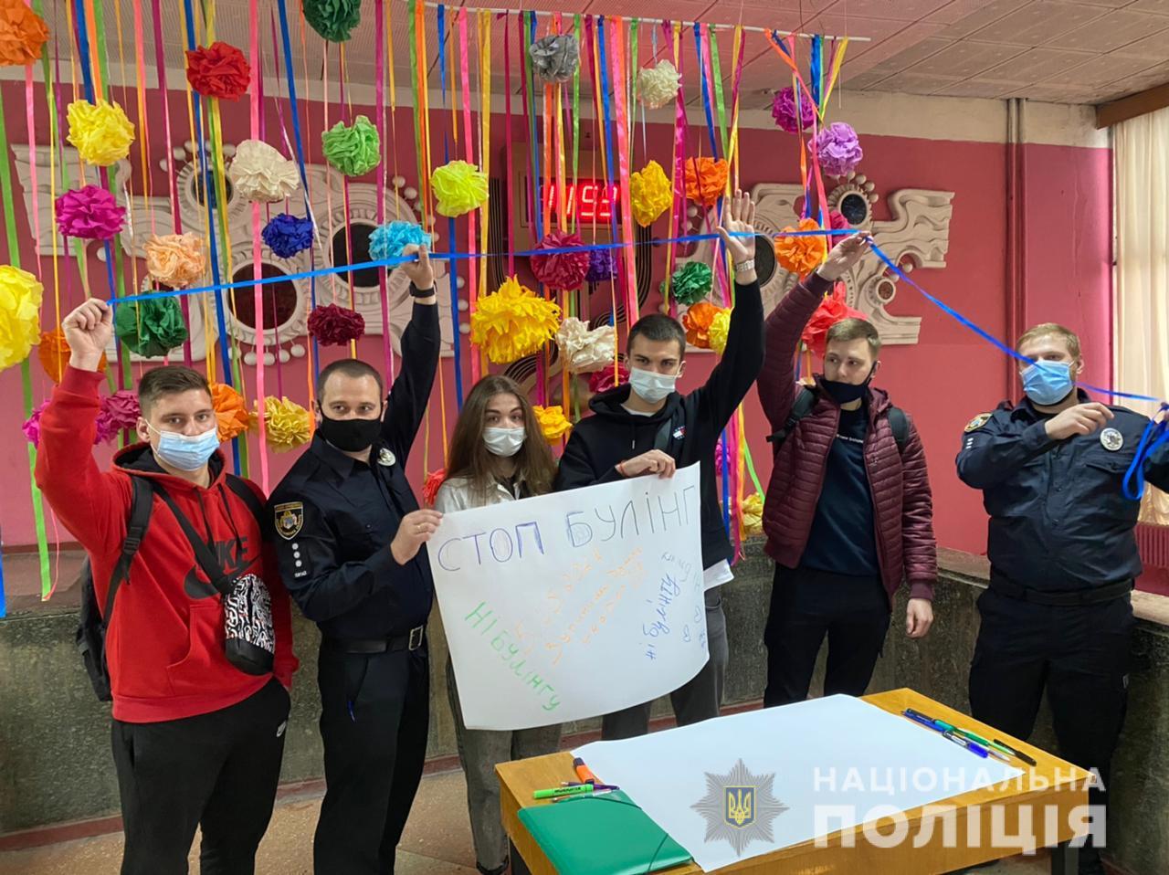 Співробітники поліції провели зі школярами флешмоби, під час яких діти малювали плакати, створювали тематичні написи: «Ні булінгу!», «Школа без булінгу», «СТОП булінг», «Скажи булінгу НІ» на стрічках та іншій атрибутиці.