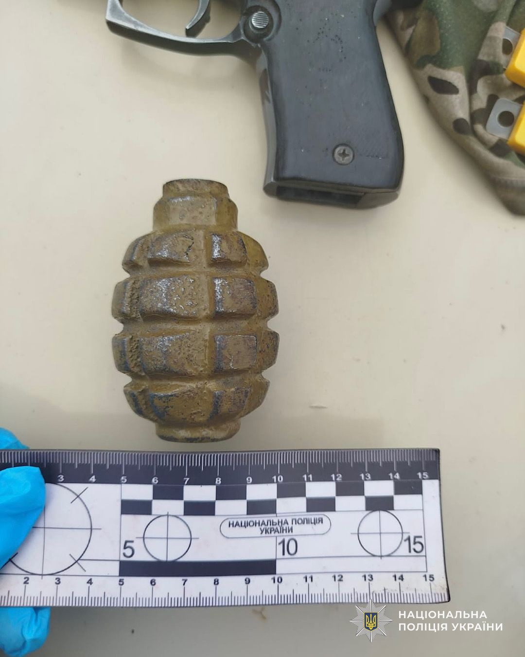 У місцевого жителя правоохоронці вилучили корпус ручної осколкової оборонної гранати Ф-1 із запалом УЗРГМ та пістолет. Усе вилучене направили на експертне дослідження.