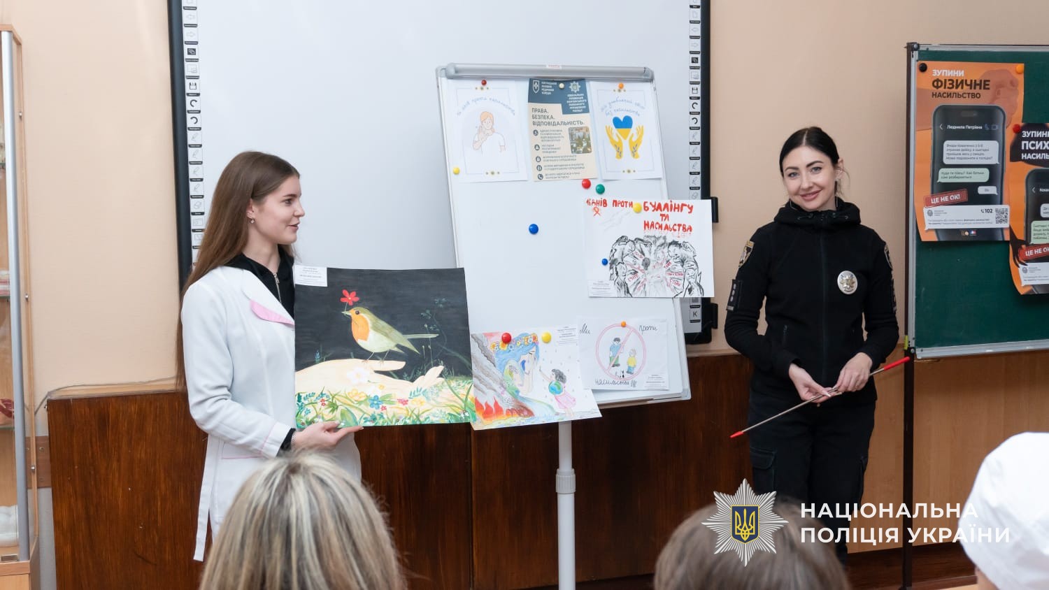Окремою частиною заходу стала презентація творчих робіт студентів. На малюнках молоді автори показали своє бачення світу без насильства - світу, де панують взаємоповага, доброта та підтримка. Поліцейська разом зі студентами переглянула роботи, обговорила їхні ідеї та наголосила, що саме молодь формує цінності, які можуть змінити суспільство на краще.