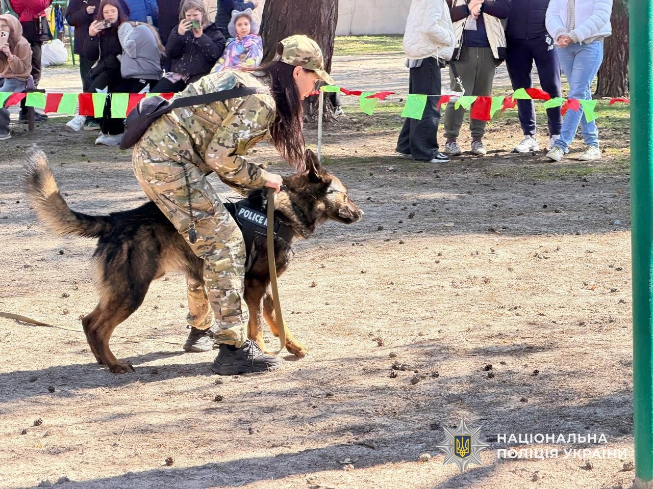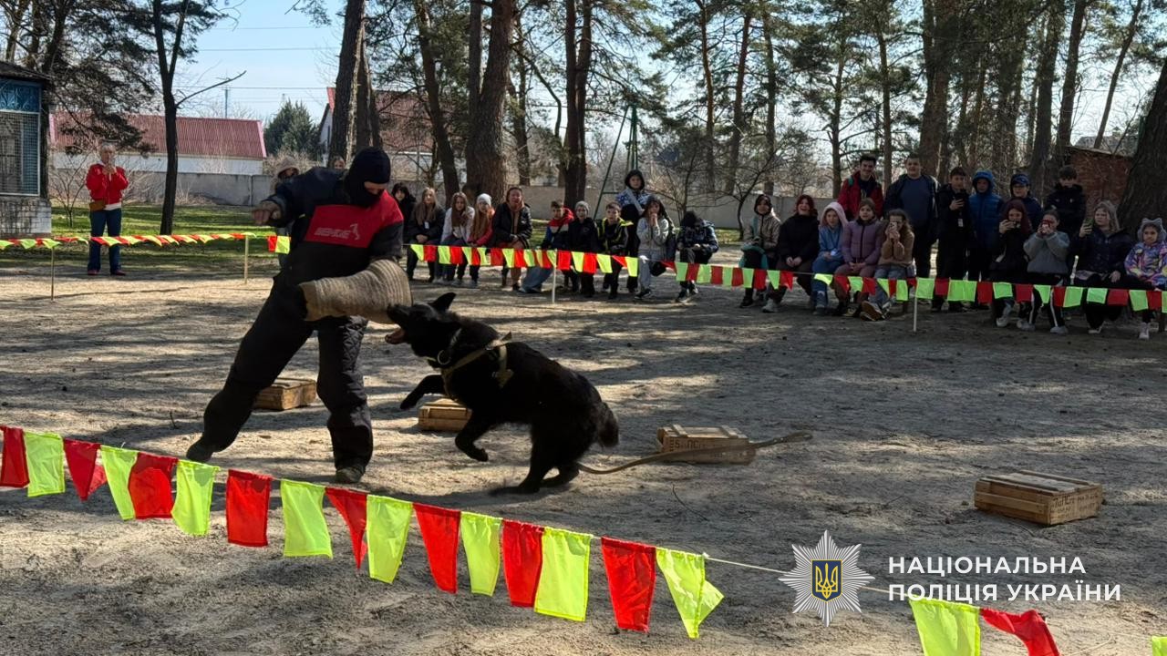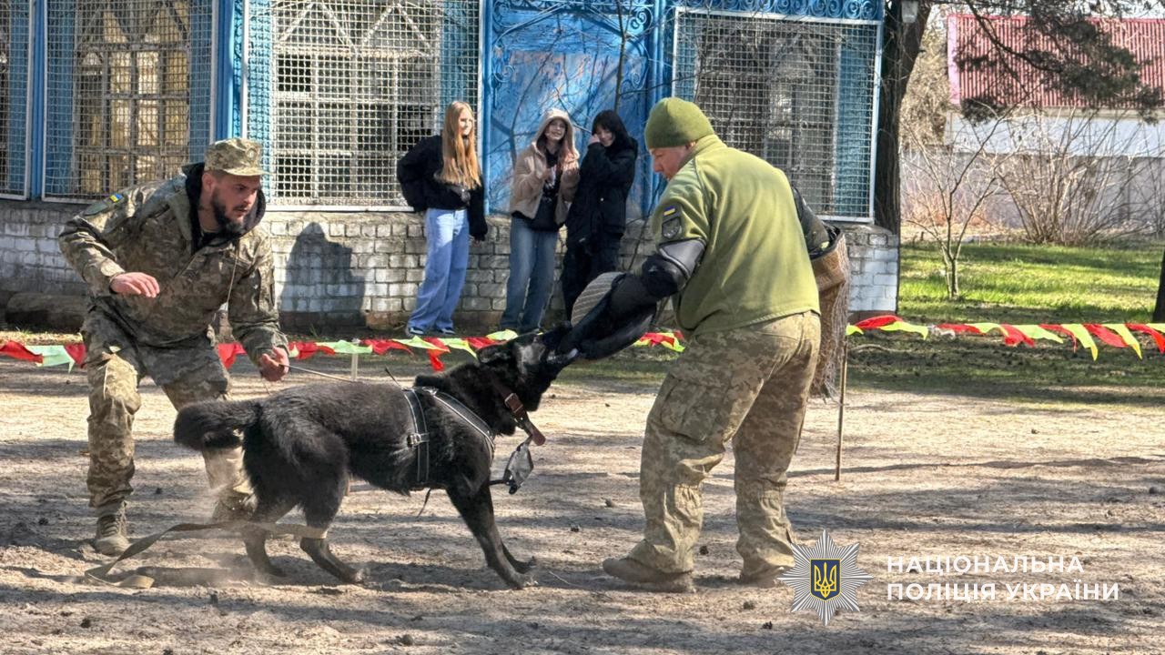 Гості продемонстрували роботу службових собак: пошук прихованих предметів, виконання команд, елементи рятувальних дій і затримання умовного правопорушника. Діти спостерігали за виступами з щирим захопленням, а військові отримали емоційну підтримку та заряд позитиву.