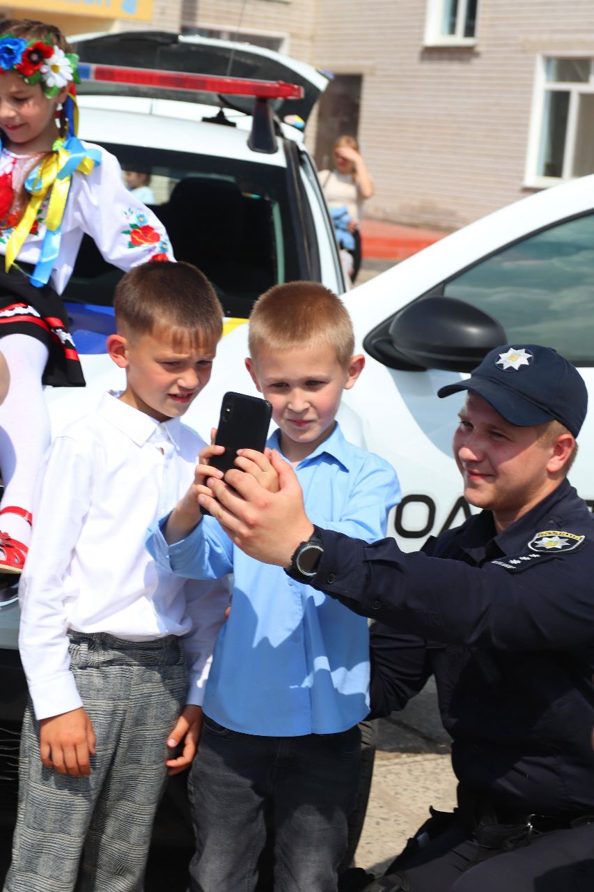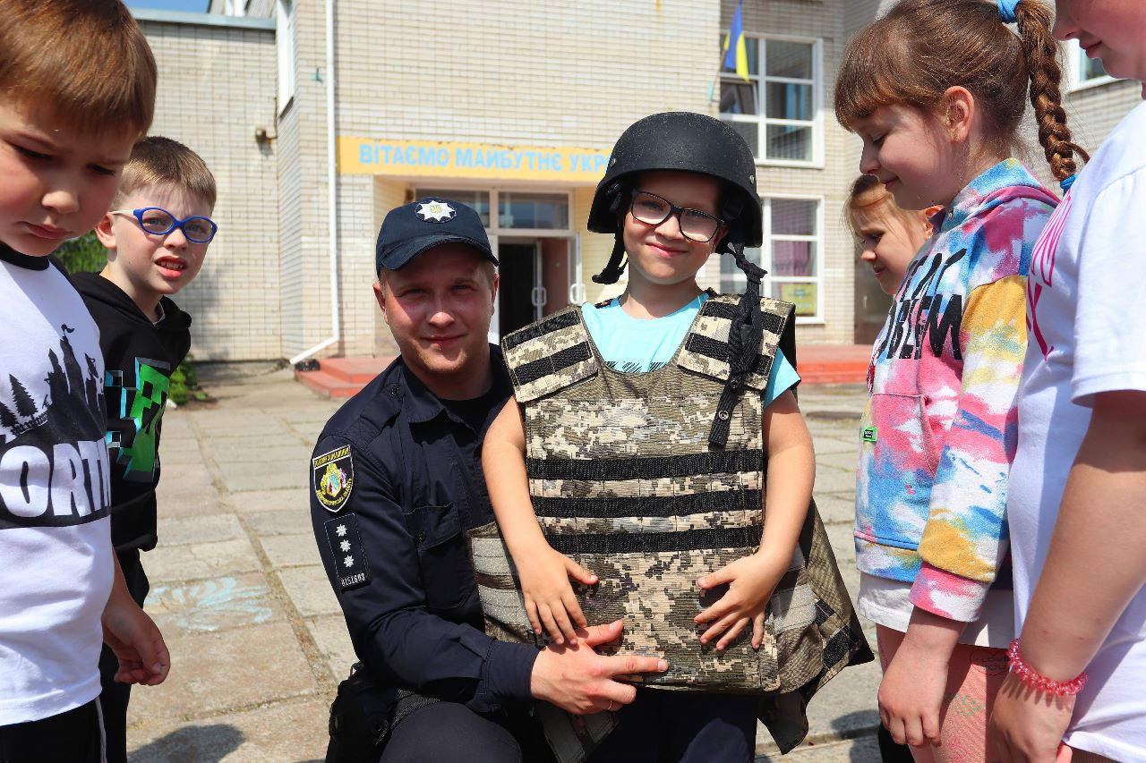Після веселих конкурсів поліцейські показали свій службовий автомобіль та спеціальне спорядження. Школярі із задоволенням приміряли на себе бронежилети, каски, посиділи за кермом автівки.