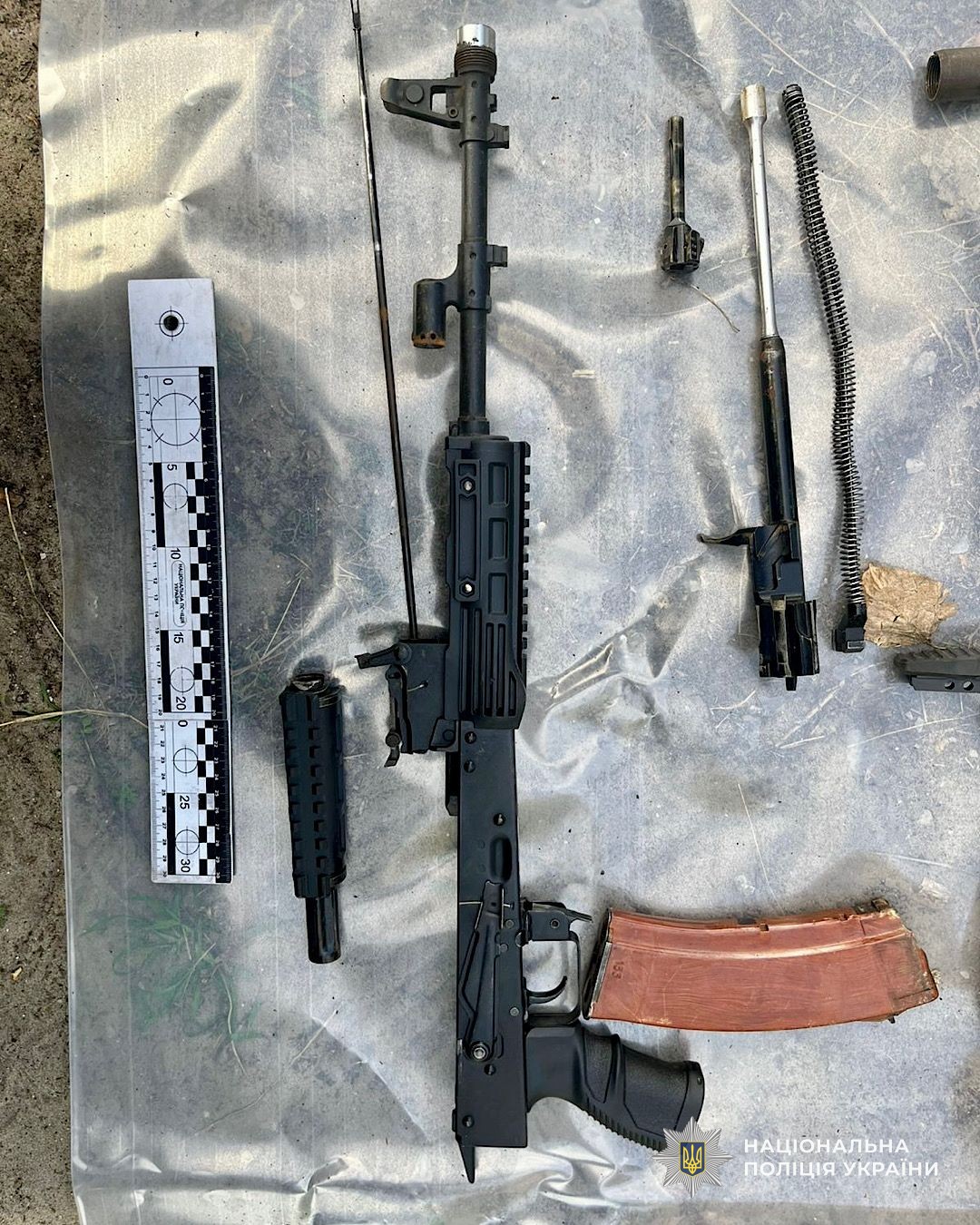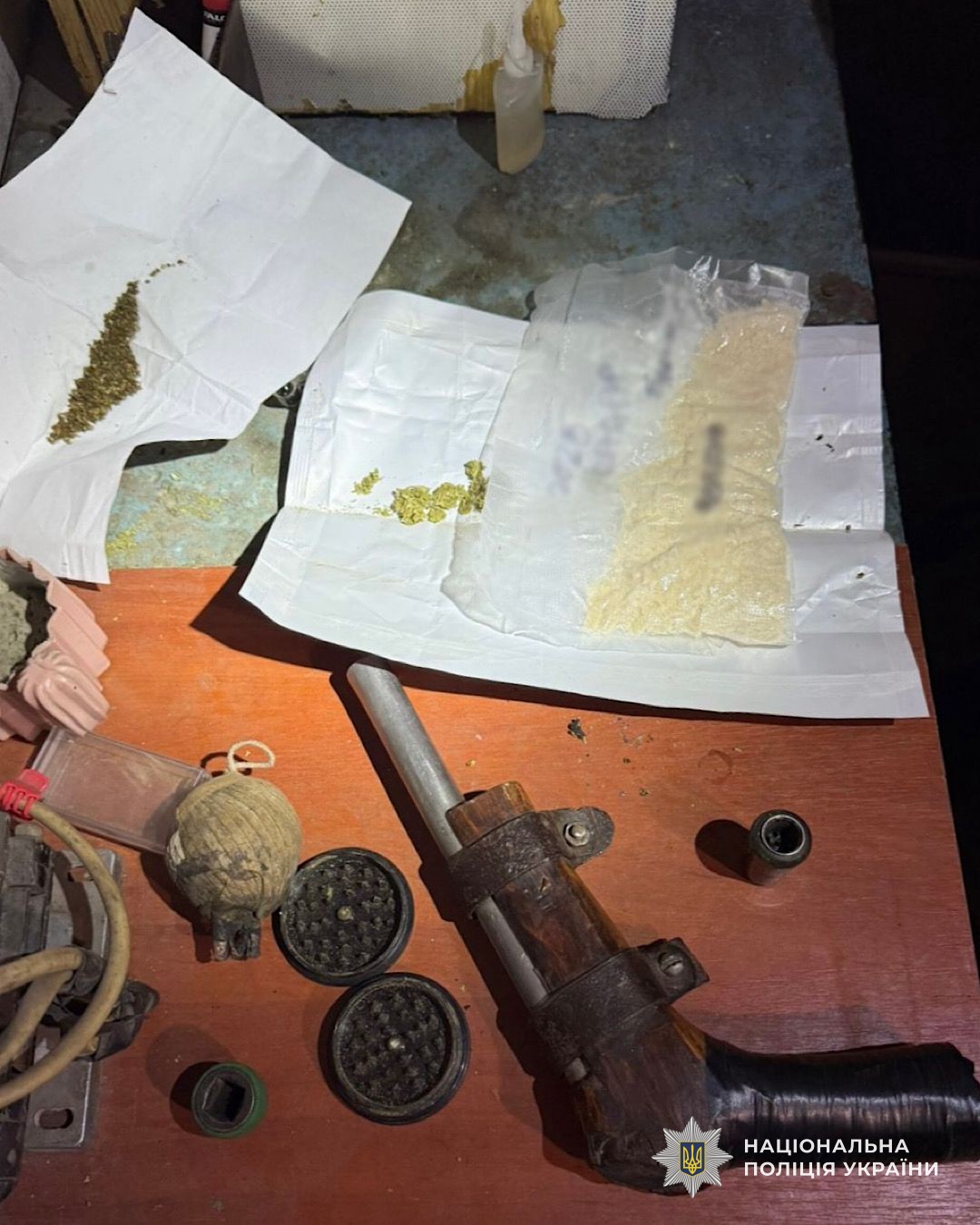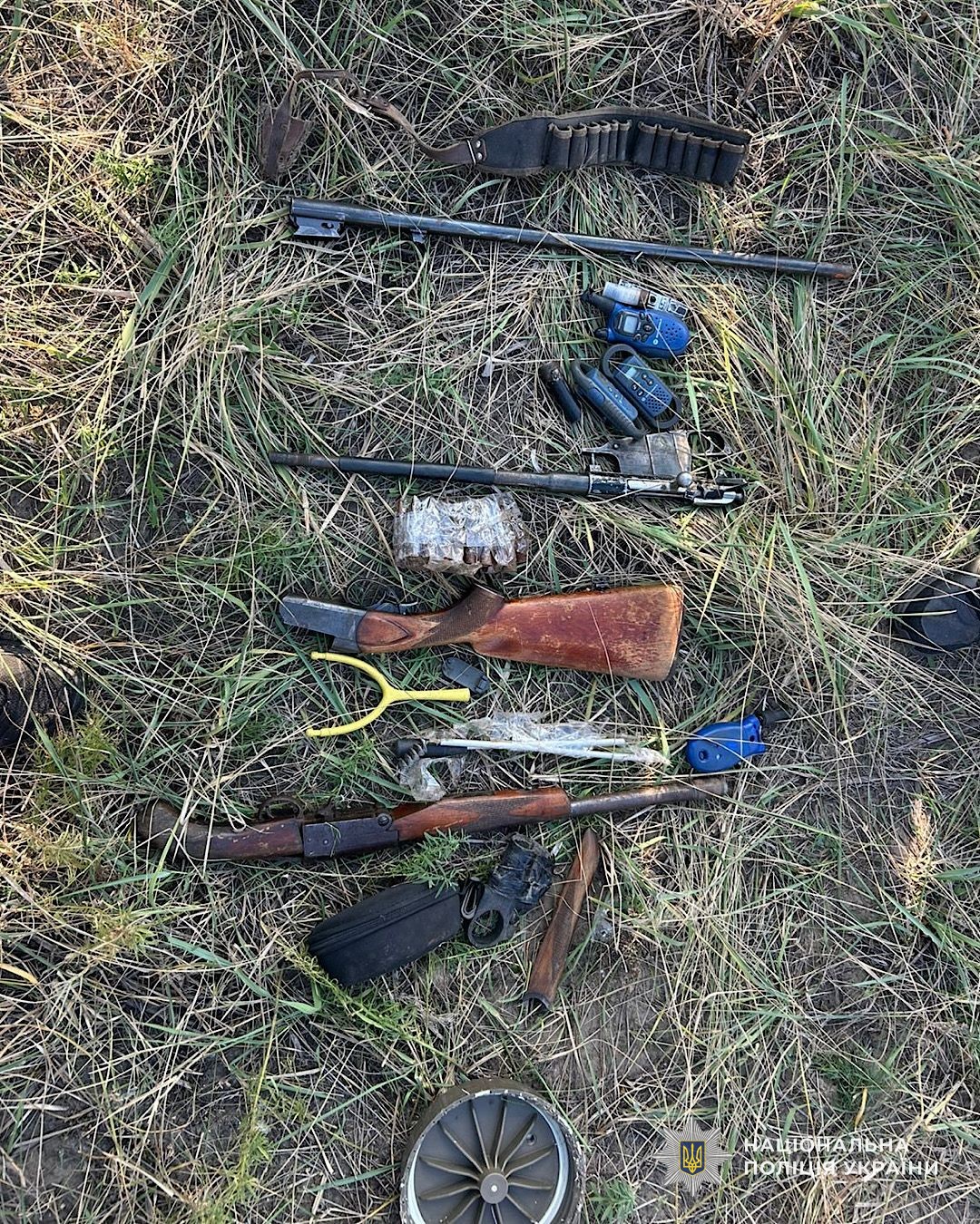 Один із фігурантів переховував зброю на прибудинковій території у траві. Крім того, під час обшуку у нього було вилучено майже 1 кілограм марихуани та близько 100 грамів психотропної речовини, схожої на метамфетамін.