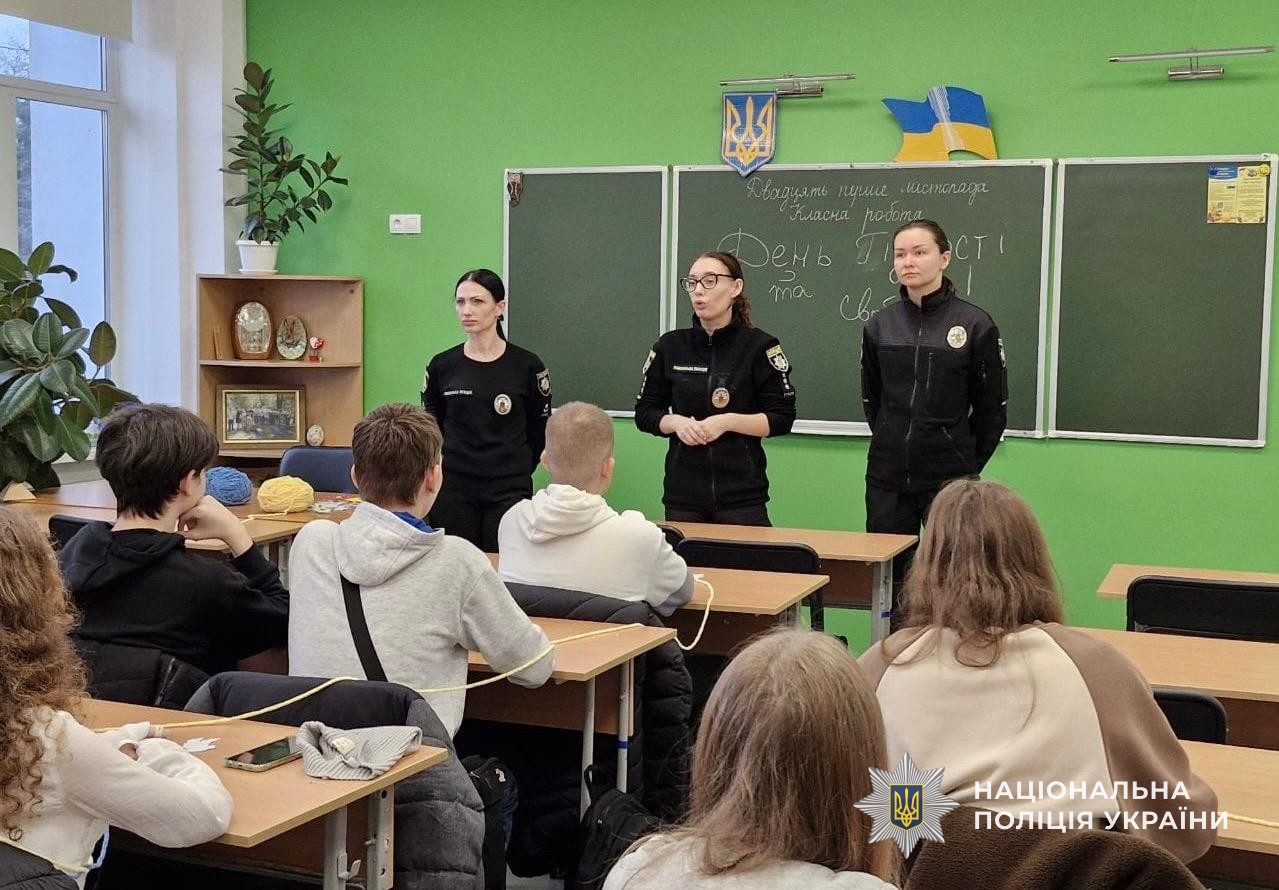 Також поліцейські разом зі школярами створили синьо-жовтий ланцюжок єдності та обговорили, що для кожного означає гідність й свобода.