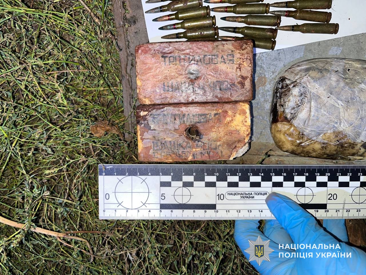 З місця події правоохоронці вилучили осколки, важіль та кільце від гранати. Під час подальшого огляду на території домоволодіння поліцейські виявили понад 200 патронів різного калібру, дві тротилові шашки, пластид, корпус гранати РГД-5 та запал УЗРГМ. Всі речові докази направили на експертизу. Встановлюється походження боєприпасів.