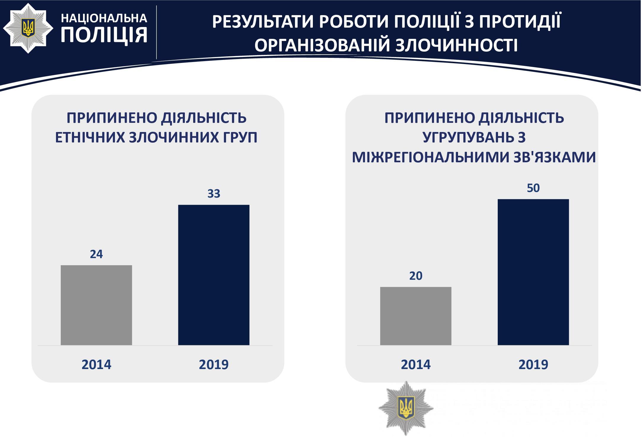 «Так, якщо в 2014 році поліція припинила діяльність 155 таких груп, то вже в 2019-му – 275, а за 8 місяців цього року – 273. Майже на 40 відсотків збільшилася кількість задокументованих етнічних злочинних груп та в 2,5 раза – угруповань з міжрегіональними зв’язками. З початку цього року під варту відправлено майже 400 учасників організованих груп та злочинних організацій. Така стрімка динаміка з одного боку свідчить про покращення ефективності роботи правоохоронців, але з іншого – говорить про активізацію злочинності. І це безумовне підтвердження важливості налагодження системної боротьби з організованою злочинністю», - наголосив Ігор Клименко.