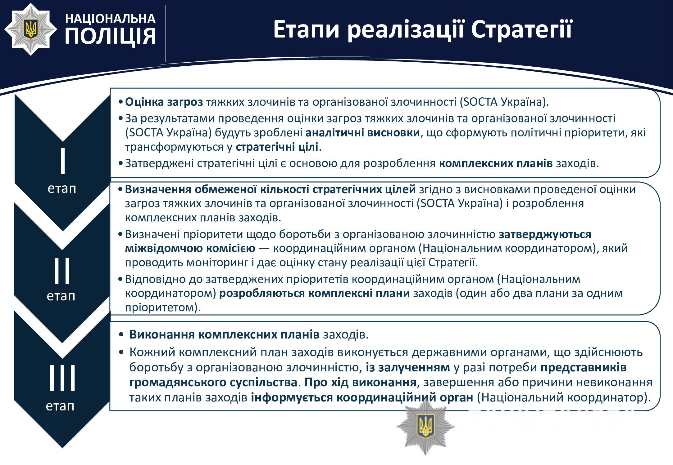 Реалізація Стратегії передбачає три етапи. Спершу проведуть оцінку наявних загроз за методологією SOCTA, яка ефективно використовується в країнах Євросоюзу. Далі на основі зібраних даних будуть створені комплексні плани заходів для протидії організованим групам і конкретним тяжким злочинам, які здебільшого вчиняються з використанням зброї та насилля. Ці плани розроблятиме Національний координатор – створена при Кабміні міжвідомча комісія, яка буде проводити моніторинг і оцінюватиме стан реалізації цієї Стратегії. Третій етап передбачає власне виконання комплексних планів заходів державними органами, які борються з організованою злочинністю.