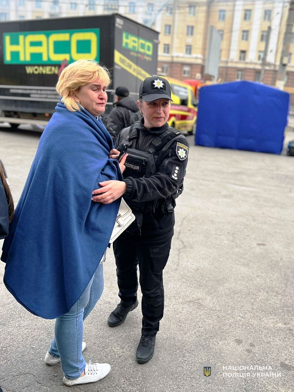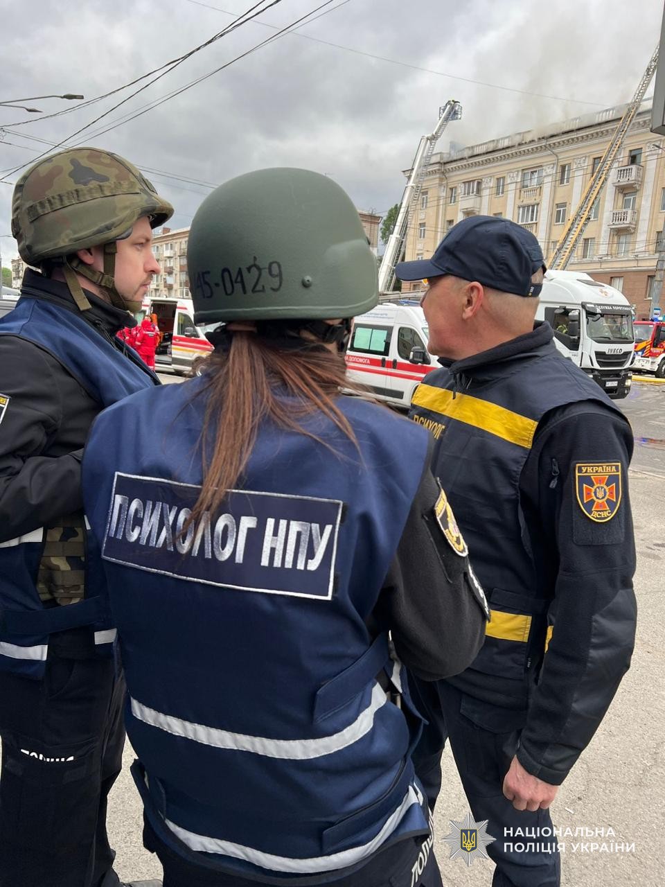 У Дніпрі в результаті ворожої атаки була частково зруйнована житлова пʼятиповерхівка, загинули та отримали травми мирні люди. У будинку виникла пожежа, її ліквідували рятувальники. Зараз поліція працює на місці події та надає допомогу постраждалим. Поліцейські допомагають евакуйовувати людей з пошкодженого будинку.