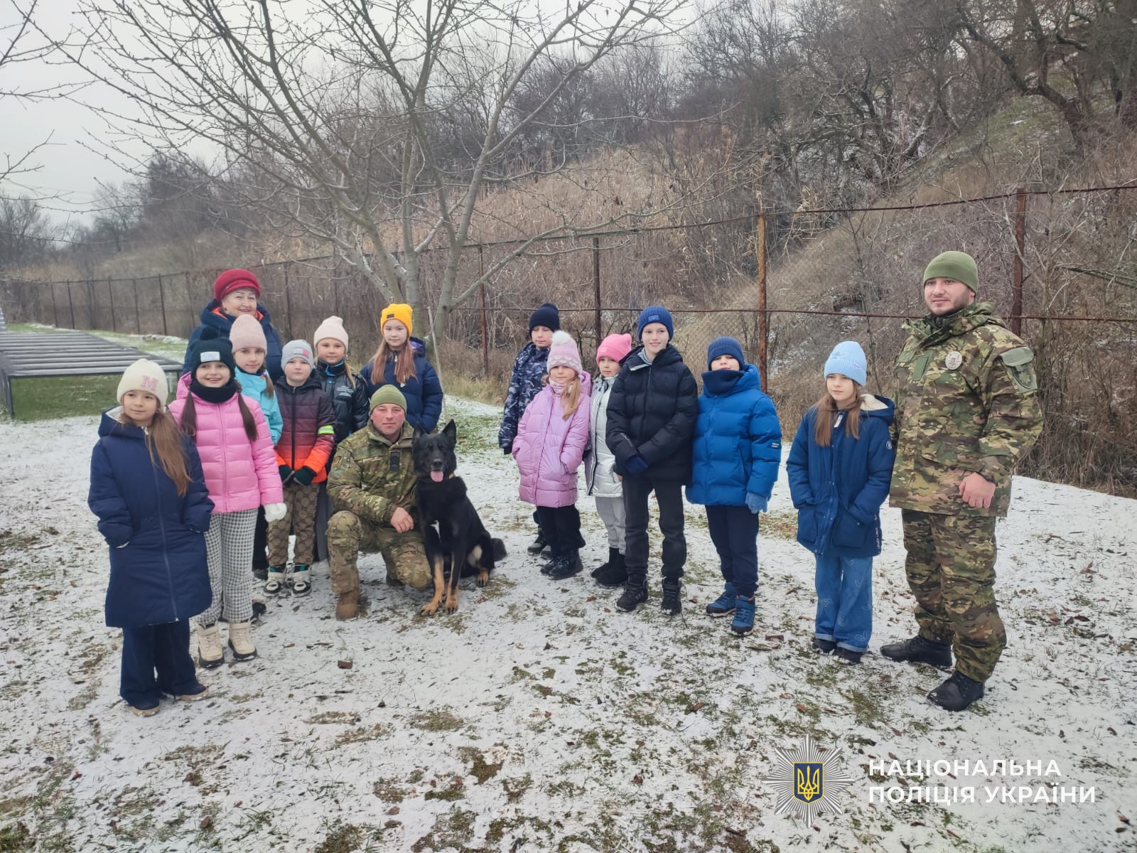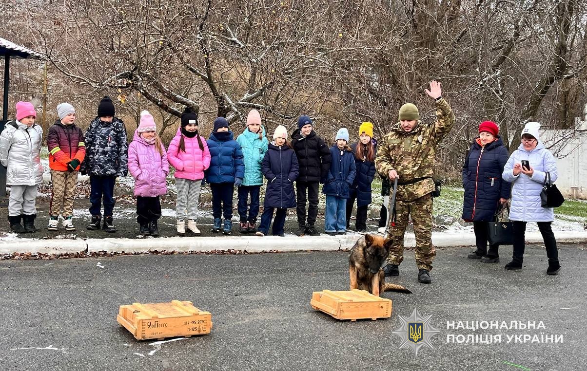 Під час зустрічі діти дізналися про особливості служби кінологів та роль службових собак у роботі поліції. Дітям продемонстрували початкові етапи підготовки юного пса на ім’я Танк. Він показав базові вправи, з яких розпочинається навчання майбутніх службово-розшукових собак. Німецька вівчарка Атос, натренована на пошук вибухових речовин та зброї, продемонструвала навички виявлення вибухонебезпечних предметів у ручній поклажі, транспортних засобах та приміщеннях. Також дітям показали, як відбувається затримання порушника за допомогою службових собак.
