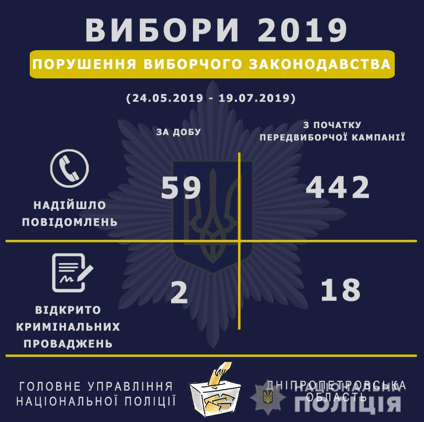 Всього, станом на 19 липня у поліції Дніпропетровської області зареєстровано 442 повідомлення про ймовірні порушення, пов’язані з виборчим процесом, відкрито 18 кримінальних проваджень, складено 103 адміністративні протоколи.
