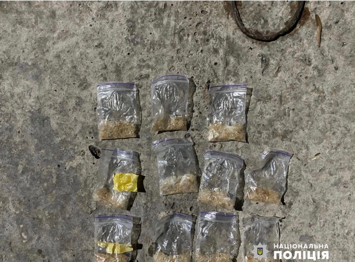 Під час поверхневого огляду правоохоронці виявили у підозрюваного 21 згорток з наркотичною речовиною, схожою на психотроп «PVP». У місцях закладок, які зловмисник встиг зробити, поліцейські вилучили ще 14 доз із забороненою речовиною.